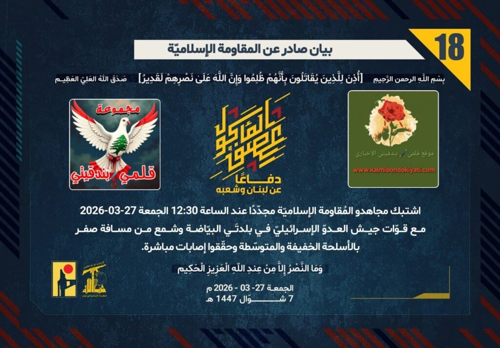 أصدرت المقاومة الاسلامية بعد البيان رقم (16 و 17) مباشرة بيان رقم “18” :”دفاعًا عن لبنان وشعبه، اشتبك مجاهدو المُقاومة الإسلاميّة مجدّدًا عند الساعة 12:30 الجمعة 27-03-2026 مع قوّات جيش العدوّ الإسرائيليّ في بلدتَي البيّاضة وشمع من مسافة صفر بالأسلحة الخفيفة والمتوسّطة وحقّقوا إصابات مباشرة.