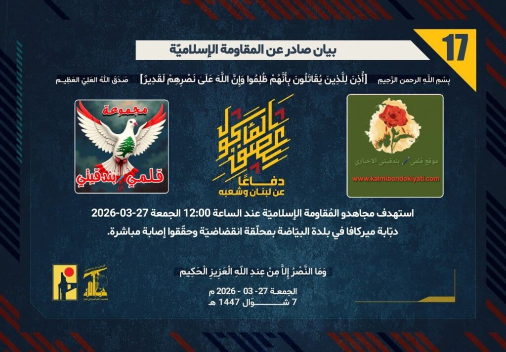 أصدرت المقاومة الاسلامية بعد البيان رقم “16” مباشرة بيان رقم”17″ :”دفاعًا عن لبنان وشعبه، استهدف مجاهدو المُقاومة الإسلاميّة عند الساعة 12:00 الجمعة 27-03-2026 دبّابة ميركافا في بلدة البيّاضة بمحلّقة انقضاضيّة وحقّقوا إصابة مباشرة.