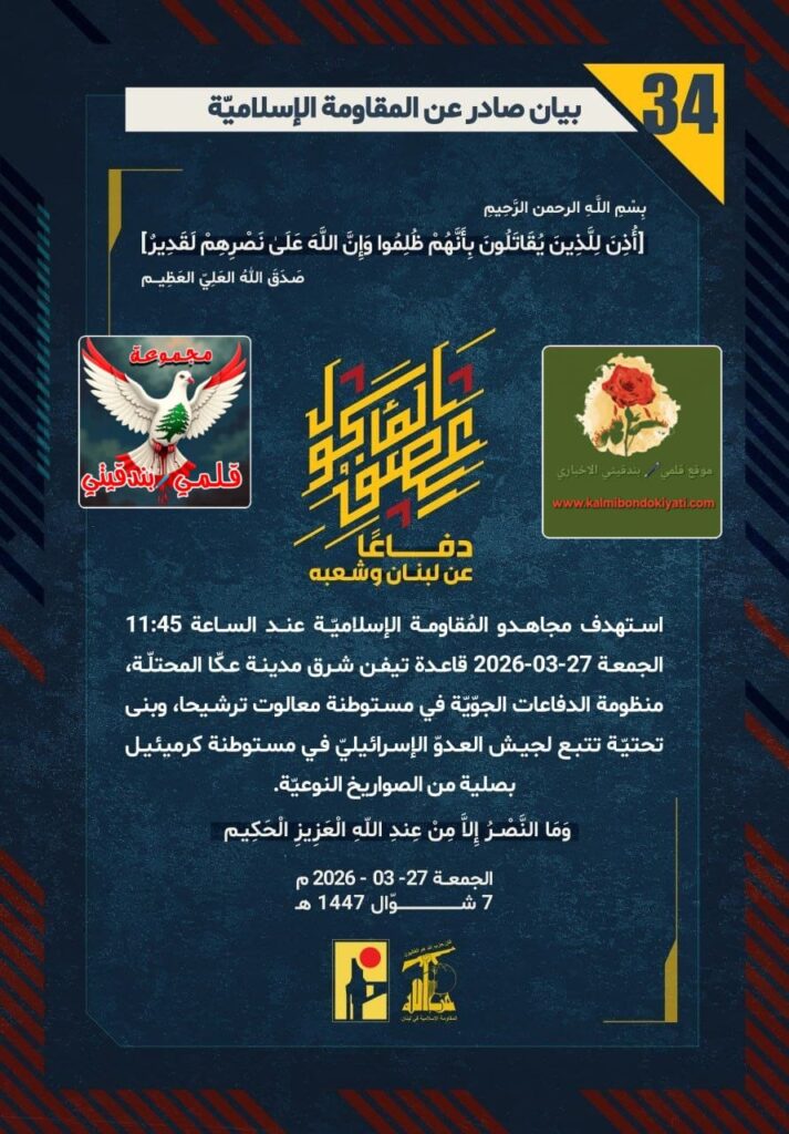 ุฃุตุฏุฑุช ุงูู ูุงูู ุฉ ุงูุงุณูุงู ูุฉ ุจุนุฏ ุงูุจูุงู ุฑูู “33” ู ุจุงุดุฑุฉ ุจูุงู ุฑูู “34” :โุฏูุงุนูุง ุนู ูุจูุงู ูุดุนุจูุ ุงุณุชูุฏู ู ุฌุงูุฏู ุงูู ููุงูู ุฉ ุงูุฅุณูุงู ููุฉ ุนูุฏ ุงูุณุงุนุฉ 11:45 ุงูุฌู ุนุฉ 27-03-2026 ูุงุนุฏุฉ ุชููู ุดุฑู ู ุฏููุฉ ุนููุง ุงูู ุญุชููุฉุ ู ูุธูู ุฉ ุงูุฏูุงุนุงุช ุงูุฌููููุฉ ูู ู ุณุชูุทูุฉ ู ุนุงููุช ุชุฑุดูุญุงุ ูุจูู ุชุญุชููุฉ ุชุชุจุน ูุฌูุด ุงูุนุฏูู ุงูุฅุณุฑุงุฆูููู ูู ู ุณุชูุทูุฉ ูุฑู ูุฆูู ุจุตููุฉ ู ู ุงูุตูุงุฑูุฎ ุงูููุนููุฉ.