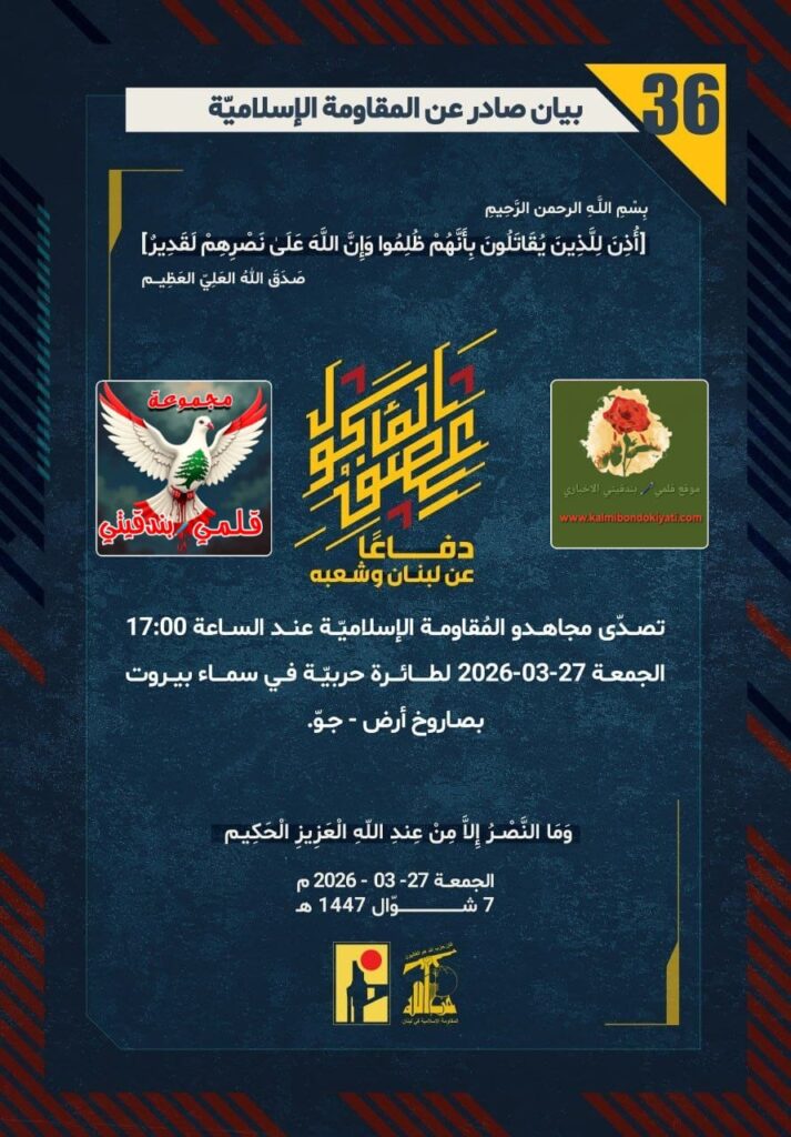 أصدرت المقاومة الاسلامية بعد البيان رقم “35” مباشرة بيان رقم “36” :”دفاعًا عن لبنان وشعبه، تصدّى مجاهدو المُقاومة الإسلاميّة عند الساعة 17:00 الجمعة 27-03-2026 لطائرة حربيّة في سماء بيروت بصاروخ أرض – جوّ.