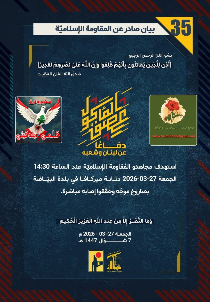 صدر بيان رقم “35” للمقاومة الاسلامية الآتي نصه:”دفاعًا عن لبنان وشعبه، استهدف مجاهدو المُقاومة الإسلاميّة عند الساعة 14:30 الجمعة 27-03-2026 دبّابة ميركافا في بلدة البيّاضة بصاروخ موجّه وحقّقوا إصابة مباشرة.