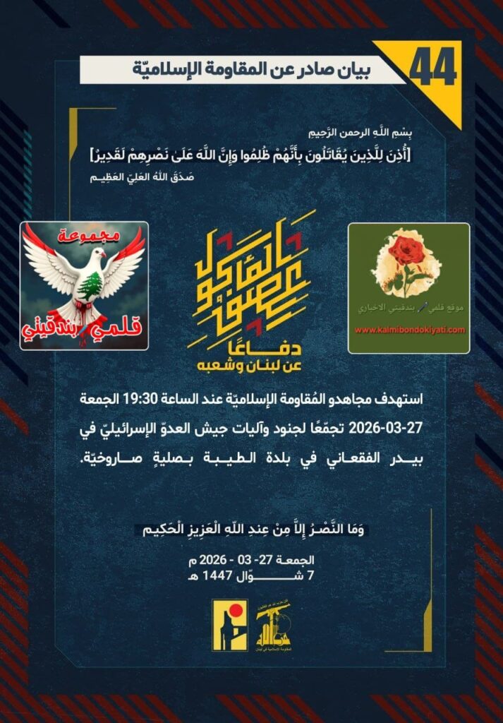 أصدرت المقاومة الاسلامية بعد البيان رقم “43” مباشرة بيان رقم”44″ :”دفاعًا عن لبنان وشعبه، استهدف مجاهدو المُقاومة الإسلاميّة عند الساعة 19:30 الجمعة 27-03-2026 تجمّعًا لجنود وآليات جيش العدوّ الإسرائيليّ في بيدر الفقعاني في بلدة الطيبة بصليةٍ صاروخيّة.