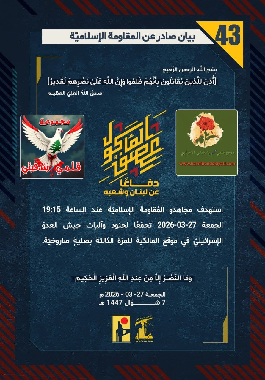 صدر بيان رقم “43“ للمقاومة الاسلامية الآتي نصه:”دفاعًا عن لبنان وشعبه، استهدف مجاهدو المُقاومة الإسلاميّة عند الساعة 19:15 الجمعة 27-03-2026 تجمّعًا لجنود وآليات جيش العدوّ الإسرائيليّ في موقع المالكية للمرّة الثالثة بصليةٍ صاروخيّة.