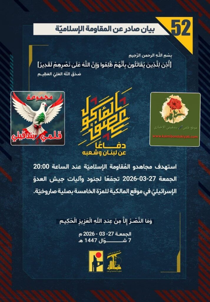 أصدرت المقاومة الاسلامية بعد البيان رقم “51” مباشرة بيان رقم “52” :”دفاعًا عن لبنان وشعبه، استهدف مجاهدو المُقاومة الإسلاميّة عند الساعة 20:00 الجمعة 27-03-2026 تجمّعًا لجنود وآليات جيش العدوّ الإسرائيليّ في موقع المالكية للمرّة الخامسة بصلية صاروخيّة.