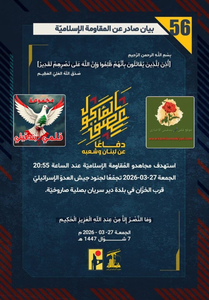 أصدرت المقاومة الاسلامية بعد البيان رقم ’55’ مباشرة بيان رقم’56’ :”دفاعًا عن لبنان وشعبه، استهدف مجاهدو المُقاومة الإسلاميّة عند الساعة 20:55 الجمعة 27-03-2026 تجمّعًا لجنود جيش العدوّ الإسرائيليّ قرب الخزّان في بلدة دير سريان بصلية صاروخيّة.