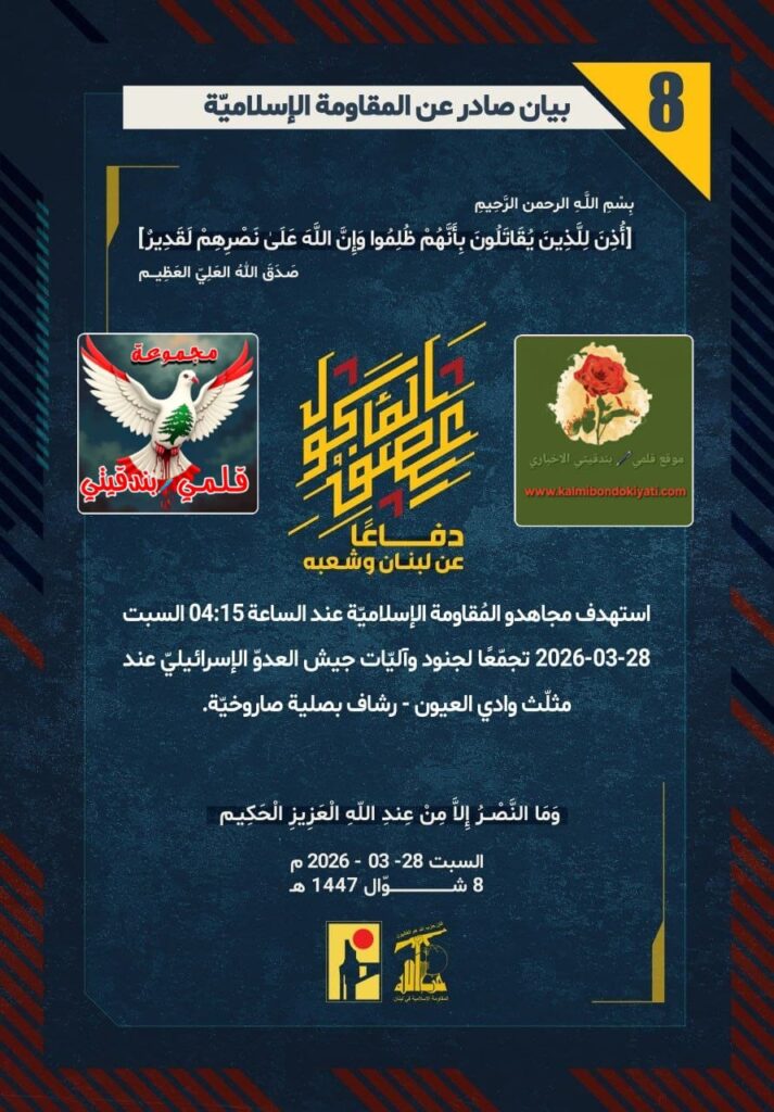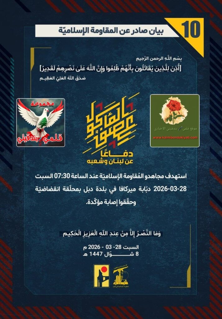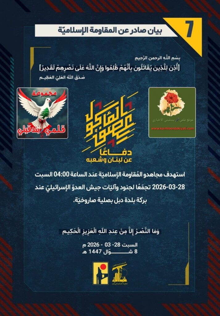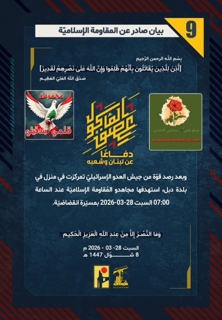 ุฃุตุฏุฑุช ุงูู ูุงูู ุฉ ุงูุงุณูุงู ูุฉ ุจุนุฏ ุงูุจูุงู ุฑูู ู ู (6 ุงูู 8) ู ุจุงุดุฑุฉ ุจูุงู ุฑูู “9” :โุฏูุงุนูุง ุนู ูุจูุงู ูุดุนุจูุ ูุจุนุฏ ุฑุตุฏ ูููุฉ ู ู ุฌูุด ุงูุนุฏู ุงูุฅุณุฑุงุฆูููู ุชู ุฑูุฒุช ูู ู ูุฒู ูู ุจูุฏุฉ ุฏุจูุ ุงุณุชูุฏููุง ู ุฌุงูุฏู ุงูู ููุงูู ุฉ ุงูุฅุณูุงู ููุฉ ุนูุฏ ุงูุณุงุนุฉ 07:00 ุงูุณุจุช 28-03-2026 ุจู ุณููุฑุฉ ุงููุถุงุถููุฉ.