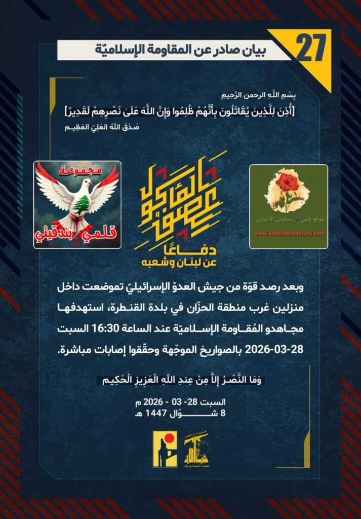 ุฃุตุฏุฑุช ุงูู ูุงูู ุฉ ุงูุงุณูุงู ูุฉ ุจุนุฏ ุงูุจูุงู ุฑูู “26” ู ุจุงุดุฑุฉ ุจูุงู ุฑูู “27” :โุฏูุงุนูุง ุนู ูุจูุงู ูุดุนุจูุ ูุจุนุฏ ุฑุตุฏ ูููุฉ ู ู ุฌูุด ุงูุนุฏูู ุงูุฅุณุฑุงุฆูููู ุชู ูุถุนุช ุฏุงุฎู ู ูุฒููู ุบุฑุจ ู ูุทูุฉ ุงูุญุฒูุงู ูู ุจูุฏุฉ ุงูููุทุฑุฉุ ุงุณุชูุฏููุง ู ุฌุงูุฏู ุงูู ููุงูู ุฉ ุงูุฅุณูุงู ููุฉ ุนูุฏ ุงูุณุงุนุฉ 16:30 ุงูุณุจุช 28-03-2026 ุจุงูุตูุงุฑูุฎ ุงูู ูุฌููุฉ ูุญููููุง ุฅุตุงุจุงุช ู ุจุงุดุฑุฉ.
