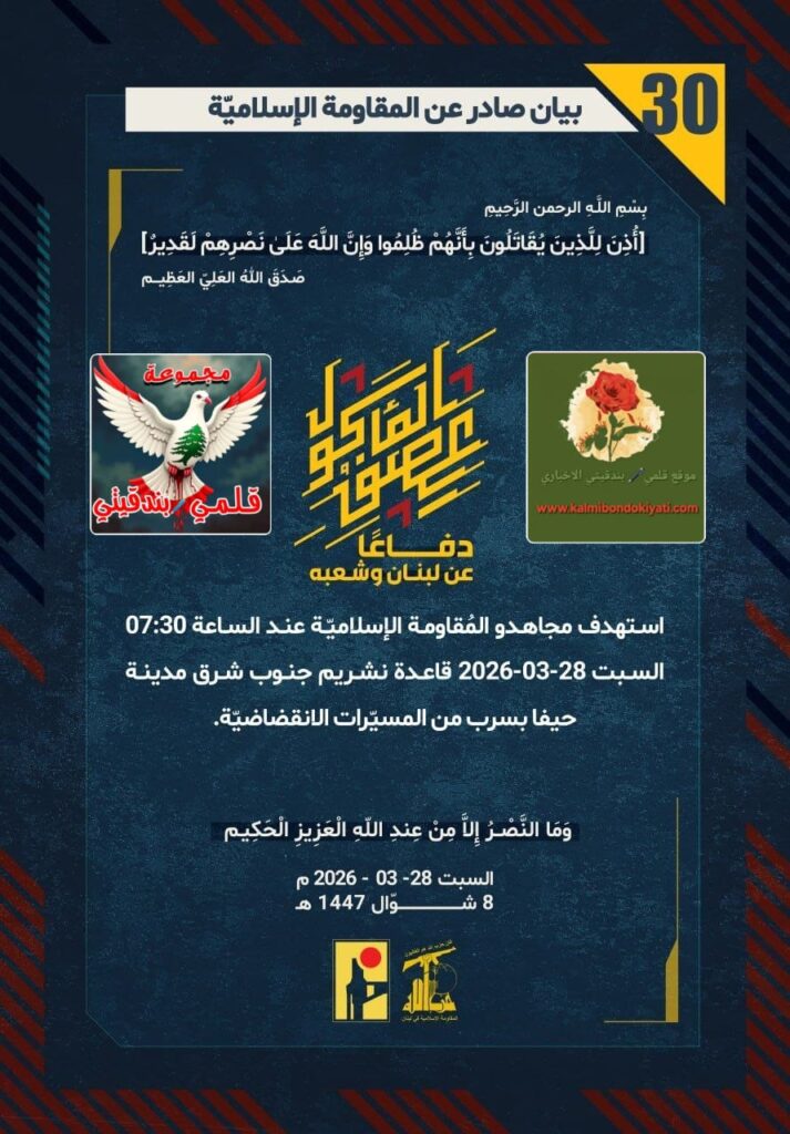 أصدرت المقاومة الاسلامية بعد البيان رقم “29” مباشرة بيان رقم “30” :”دفاعًا عن لبنان وشعبه، استهدف مجاهدو المُقاومة الإسلاميّة عند الساعة 07:30 السبت 28-03-2026 قاعدة نشريم جنوب شرق مدينة حيفا بسرب من المسيّرات الانقضاضيّة.