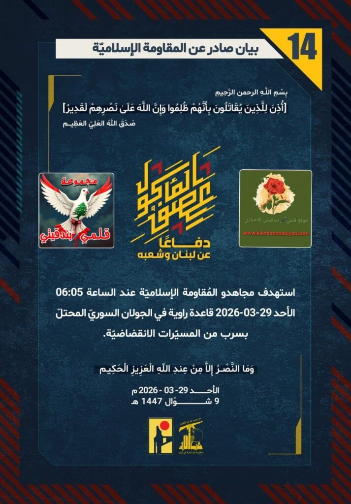ุฏูุงุนู‹ุง ุนู† ู„ุจู†ุงู† ูˆุดุนุจู‡ุŒ ุงุณุชู‡ุฏู ู…ุฌุงู‡ุฏูˆ ุงู„ู…ูู‚ุงูˆู…ุฉ ุงู„ุฅุณู„ุงู…ูŠู‘ุฉ ุนู†ุฏ ุงู„ุณุงุนุฉ 06:05 (ุงู„ุฃุญุฏ) ู‚ุงุนุฏุฉ ุฑุงูˆูŠุฉ ููŠ ุงู„ุฌูˆู„ุงู† ุงู„ุณูˆุฑูŠู‘ ุงู„ู…ุญุชู„ู‘ ุจุณุฑุจู ู…ู† ุงู„ู…ุณูŠู‘ุฑุงุช ุงู„ุงู†ู‚ุถุงุถูŠู‘ุฉ.