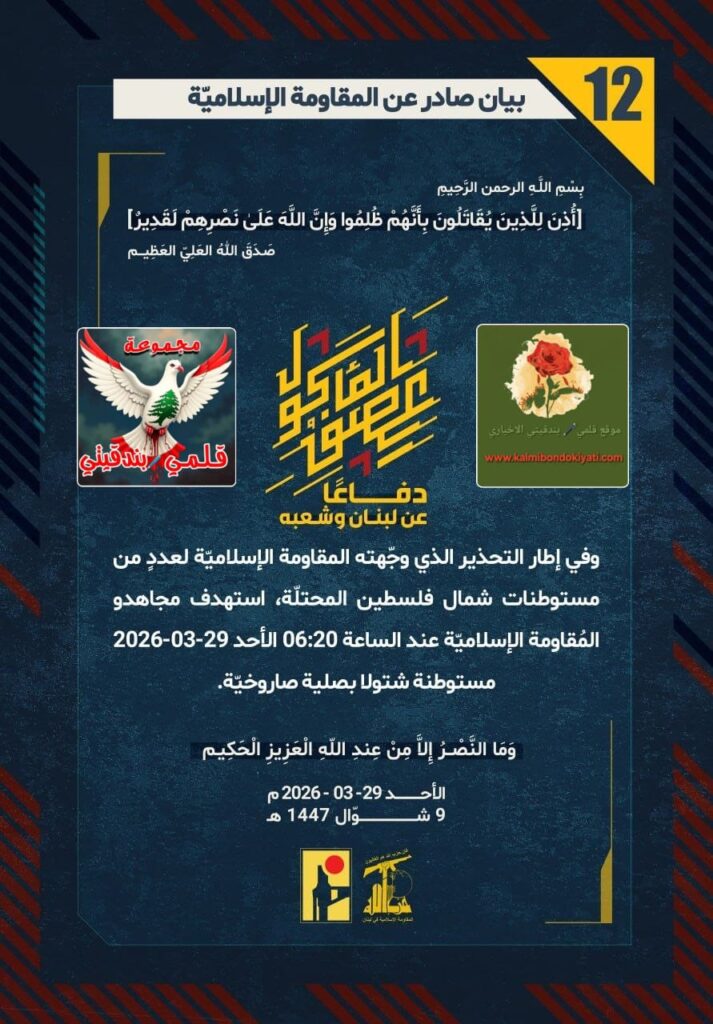 ุฏูุงุนู‹ุง ุนู† ู„ุจู†ุงู† ูˆุดุนุจู‡ุŒ ูˆููŠ ุฅุทุงุฑ โ€ุงู„ุชุญุฐูŠุฑ ุงู„ู‘ุฐูŠ ูˆุฌู‘ู‡ุชู‡ ุงู„ู…ู‚ุงูˆู…ุฉ ุงู„ุฅุณู„ุงู…ูŠู‘ุฉ ู„ุนุฏุฏู ู…ู† ุงู„ู…ุณุชูˆุทู†ุงุชุŒ ุงุณุชู‡ุฏู ุงู„ู…ุฌุงู‡ุฏูˆู† ุนู†ุฏ ุงู„ุณุงุนุฉ 05:00 (ุงู„ุฃุญุฏ) ู…ุณุชูˆุทู†ุฉ ุงู„ู…ุทู„ู‘ุฉ ุจุตู„ูŠุฉ ุตุงุฑูˆุฎูŠู‘ุฉ.