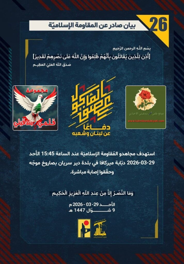 ุฃุตุฏุฑุช ุงูู ูุงูู ุฉ ุงูุงุณูุงู ูุฉ ุจุนุฏ ุงูุจูุงู ุฑูู ู ุจุงุดุฑุฉ’25’ ุจูุงู ุฑูู ’26’ :โุฏูุงุนูุง ุนู ูุจูุงู ูุดุนุจูุ ุงุณุชูุฏู ู ุฌุงูุฏู ุงูู ููุงูู ุฉ ุงูุฅุณูุงู ููุฉ ุนูุฏ ุงูุณุงุนุฉ 15:45 ุงูุฃุญุฏ 29-03-2026 ุฏุจูุงุจุฉ ู ูุฑูุงูุง ูู ุจูุฏุฉ ุฏูุฑ ุณุฑูุงู ุจุตุงุฑูุฎ ู ูุฌูู ูุญููููุง ุฅุตุงุจุฉ ู ุจุงุดุฑุฉ.