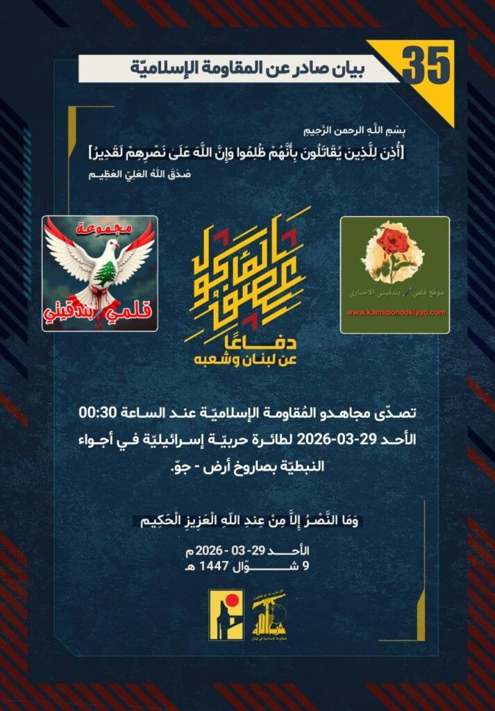 ๐โุตุฏุฑ ุจูุงู ุฑูู (35) ููู ูุงูู ุฉ ุงูุฅุณูุงู ูุฉ ุงูุขุชู ูุตู:”ุฏูุงุนูุง ุนู ูุจูุงู ูุดุนุจูุ ุชุตุฏูู ู ุฌุงูุฏู ุงูู ููุงูู ุฉ ุงูุฅุณูุงู ููุฉ ุนูุฏ ุงูุณุงุนุฉ 00:30 ุงูุฃุญุฏ 29-03-2026 ูุทุงุฆุฑุฉ ุญุฑุจููุฉ ุฅุณุฑุงุฆููููุฉ ูู ุฃุฌูุงุก ู ุฏููุฉ ุงููุจุทููุฉ ุจุตุงุฑูุฎ ุฃุฑุถ – ุฌูู.”