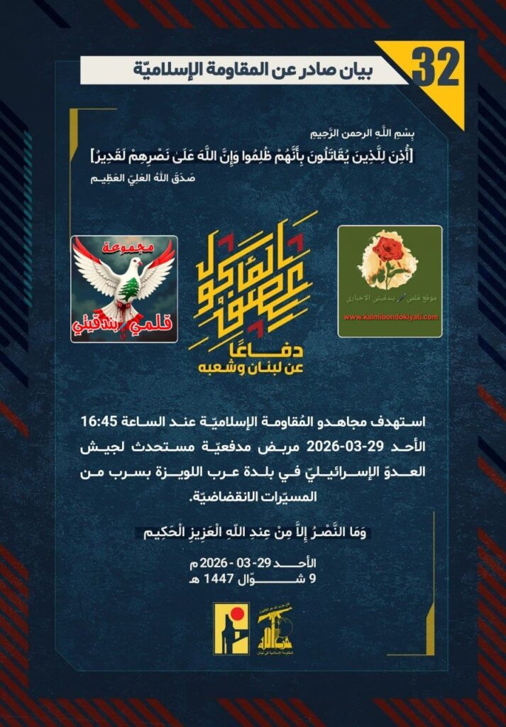 ๐โุตุฏุฑ ุจูุงู ุฑูู (32) ููู ูุงูู ุฉ ุงูุฅุณูุงู ูุฉ ุงูุขุชู ูุตู:”ุฏูุงุนูุง ุนู ูุจูุงู ูุดุนุจูุ ุงุณุชูุฏู ู ุฌุงูุฏู ุงูู ููุงูู ุฉ ุงูุฅุณูุงู ููุฉ ุนูุฏ ุงูุณุงุนุฉ 16:45 ุงูุฃุญุฏ 29-03-2026 ู ุฑุจุถ ู ุฏูุนููุฉ ู ุณุชุญุฏุซ ูุฌูุด ุงูุนุฏูู ุงูุฅุณุฑุงุฆูููู ูู ุจูุฏุฉ ุนุฑุจ ุงููููุฒุฉ ุจุณุฑุจ ู ู ุงูู ุณููุฑุงุช ุงูุงููุถุงุถููุฉ.”