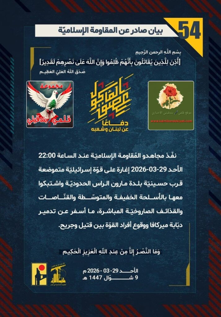 โ€‹๐Ÿ›‘ ุตุฏุฑ ุจูŠุงู† ุฑู‚ู… (54) ู„ู„ู…ู‚ุงูˆู…ุฉ ุงู„ุฅุณู„ุงู…ูŠุฉ ุงู„ุขุชูŠ ู†ุตู‡:”ุฏูุงุนู‹ุง ุนู† ู„ุจู†ุงู† ูˆุดุนุจู‡ุŒ ู†ูู‘ุฐ ู…ุฌุงู‡ุฏูˆ ุงู„ู…ูู‚ุงูˆู…ุฉ ุงู„ุฅุณู„ุงู…ูŠู‘ุฉ ุนู†ุฏ ุงู„ุณุงุนุฉ 22:00 ุงู„ุฃุญุฏ 29-03-2026 ุฅุบุงุฑุฉ ู†ูˆุนูŠุฉ ุนู„ู‰ ู‚ูˆู‘ุฉ ุฅุณุฑุงุฆูŠู„ูŠู‘ุฉ ู…ุชู…ูˆุถุนุฉ ู‚ุฑุจ ุญุณูŠู†ูŠู‘ุฉ ุจู„ุฏุฉ ู…ุงุฑูˆู† ุงู„ุฑุงุณ ุงู„ุญุฏูˆุฏูŠู‘ุฉุŒ ูˆุงุดุชุจูƒูˆุง ู…ุนู‡ุง ุจุงู„ุฃุณู„ุญุฉ ุงู„ุฎููŠูุฉ ูˆุงู„ู…ุชูˆุณู‘ุทุฉ ูˆุงู„ู‚ู†ู‘ุงุตุงุช ูˆุงู„ู‚ุฐุงุฆู ุงู„ุตุงุฑูˆุฎูŠู‘ุฉ ุงู„ู…ุจุงุดุฑุฉุŒ ู…ุง ุฃุณูุฑ ุนู† ุชุฏู…ูŠุฑ ุฏุจู‘ุงุจุฉ ู…ูŠุฑูƒุงูุง ูˆูˆู‚ูˆุน