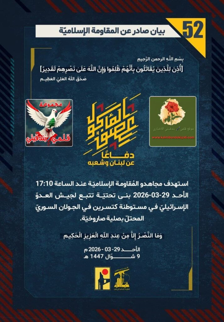 โ€‹๐Ÿ›‘ ุตุฏุฑ ุจูŠุงู† ุฑู‚ู… (52) ู„ู„ู…ู‚ุงูˆู…ุฉ ุงู„ุฅุณู„ุงู…ูŠุฉ ุงู„ุขุชูŠ ู†ุตู‡:”ุฏูุงุนู‹ุง ุนู† ู„ุจู†ุงู† ูˆุดุนุจู‡ุŒ ุงุณุชู‡ุฏู ู…ุฌุงู‡ุฏูˆ ุงู„ู…ูู‚ุงูˆู…ุฉ ุงู„ุฅุณู„ุงู…ูŠู‘ุฉ ุนู†ุฏ ุงู„ุณุงุนุฉ 17:10 ุงู„ุฃุญุฏ 29-03-2026 ุจู†ู‰ ุชุญุชูŠู‘ุฉ ุชุชุจุน ู„ุฌูŠุด ุงู„ุนุฏูˆู‘ ุงู„ุฅุณุฑุงุฆูŠู„ูŠู‘ ููŠ ู…ุณุชูˆุทู†ุฉ ูƒุชุณุฑูŠู† ููŠ ุงู„ุฌูˆู„ุงู† ุงู„ุณูˆุฑูŠู‘ ุงู„ู…ุญุชู„ู‘ ุจุตู„ูŠุฉ ุตุงุฑูˆุฎูŠู‘ุฉ.”