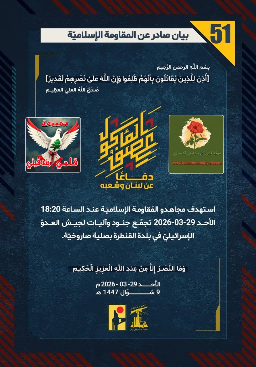 โ€‹๐Ÿ›‘ ุตุฏุฑ ุจูŠุงู† ุฑู‚ู… (51) ู„ู„ู…ู‚ุงูˆู…ุฉ ุงู„ุฅุณู„ุงู…ูŠุฉ ุงู„ุขุชูŠ ู†ุตู‡:”ุฏูุงุนู‹ุง ุนู† ู„ุจู†ุงู† ูˆุดุนุจู‡ุŒ ุงุณุชู‡ุฏู ู…ุฌุงู‡ุฏูˆ ุงู„ู…ูู‚ุงูˆู…ุฉ ุงู„ุฅุณู„ุงู…ูŠู‘ุฉ ุนู†ุฏ ุงู„ุณุงุนุฉ 18:20 ุงู„ุฃุญุฏ 29-03-2026 ุชุฌู…ู‘ุน ุฌู†ูˆุฏ ูˆุขู„ูŠุงุช ู„ุฌูŠุด ุงู„ุนุฏูˆู‘ ุงู„ุฅุณุฑุงุฆูŠู„ูŠู‘ ููŠ ุจู„ุฏุฉ ุงู„ู‚ู†ุทุฑุฉ ุจุตู„ูŠุฉ ุตุงุฑูˆุฎูŠู‘ุฉ.”