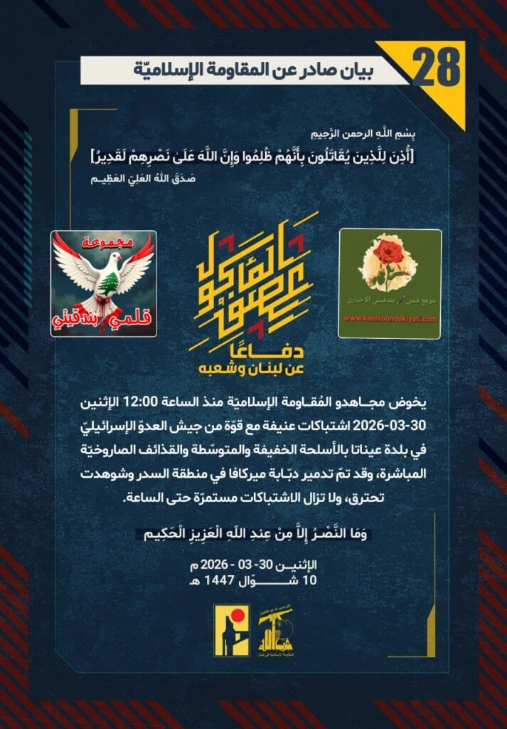 أصدرت المقاومة الاسلامية بعد البيان رقم “27” مباشرة بيان رقم “28” :”دفاعًا عن لبنان وشعبه، يخوض مجاهدو المُقاومة الإسلاميّة منذ الساعة 12:00 الإثنين 30-03-2026 اشتباكات عنيفة مع قوّة من جيش العدوّ الإسرائيليّ في بلدة عيناتا بالأسلحة الخفيفة والمتوسّطة والقذائف الصاروخيّة المباشرة، وقد تمّ تدمير دبّابة ميركافا في منطقة السدر وشوهدت تحترق، ولا تزال الاشتباكات مستمرّة حتى الساعة.