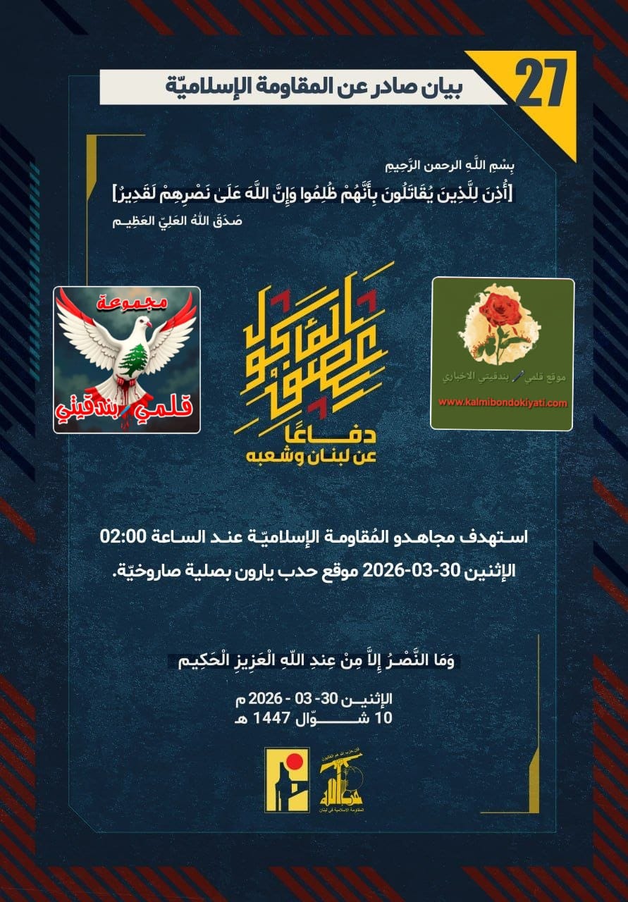 صدر بيان رقم “27” للمقاومة الاسلامية الآتي نصه:”دفاعًا عن لبنان وشعبه، استهدف مجاهدو المُقاومة الإسلاميّة عند الساعة 02:00 الإثنين 30-03-2026 موقع حدب يارون بصلية صاروخيّة.
