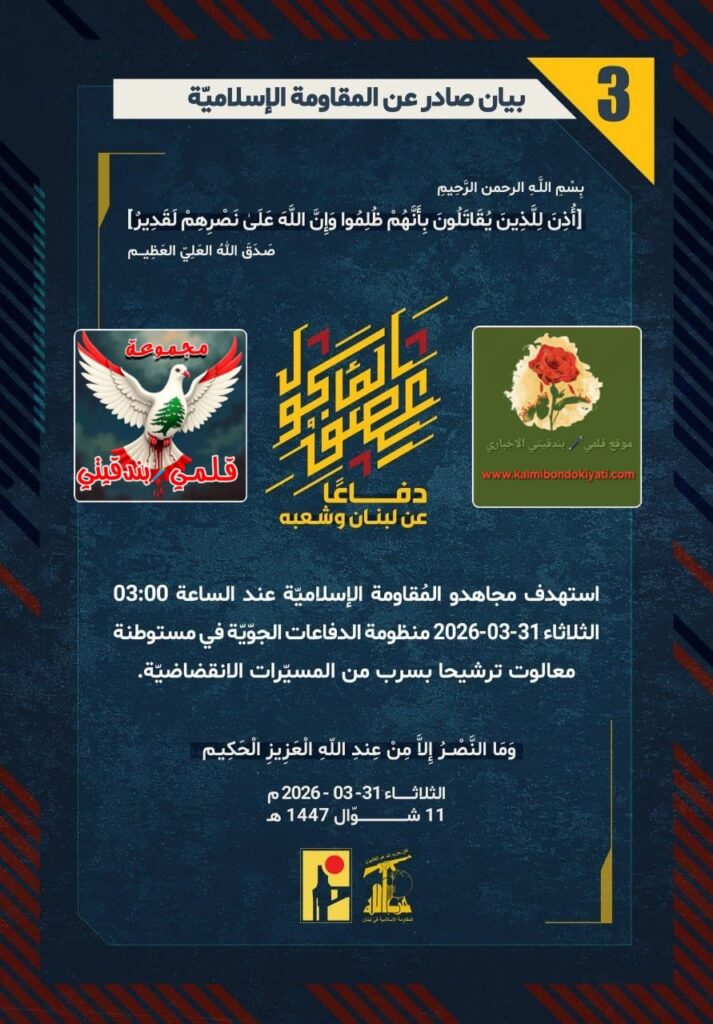 أصدرت المقاومة الاسلامية بعد البيان رقم (1 و 2) مباشرة بيان رقم “3” :”دفاعًا عن لبنان وشعبه، استهدف مجاهدو المُقاومة الإسلاميّة عند الساعة 03:00 الثلاثاء 31-03-2026 منظومة الدفاعات الجوّيّة في مستوطنة معالوت ترشيحا بسرب من المسيّرات الانقضاضيّة.