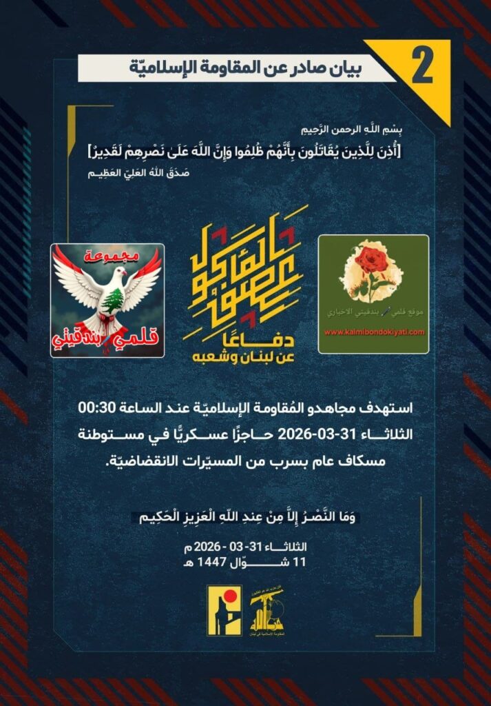 أصدرت المقاومة الاسلامية بعد البيان رقم “1”مباشرة بيان رقم” 2″ :”دفاعًا عن لبنان وشعبه، استهدف مجاهدو المُقاومة الإسلاميّة عند الساعة 00:30 الثلاثاء 31-03-2026 حاجزًا عسكريًّا في مستوطنة مسكاف عام بسرب من المسيّرات الانقضاضيّة.