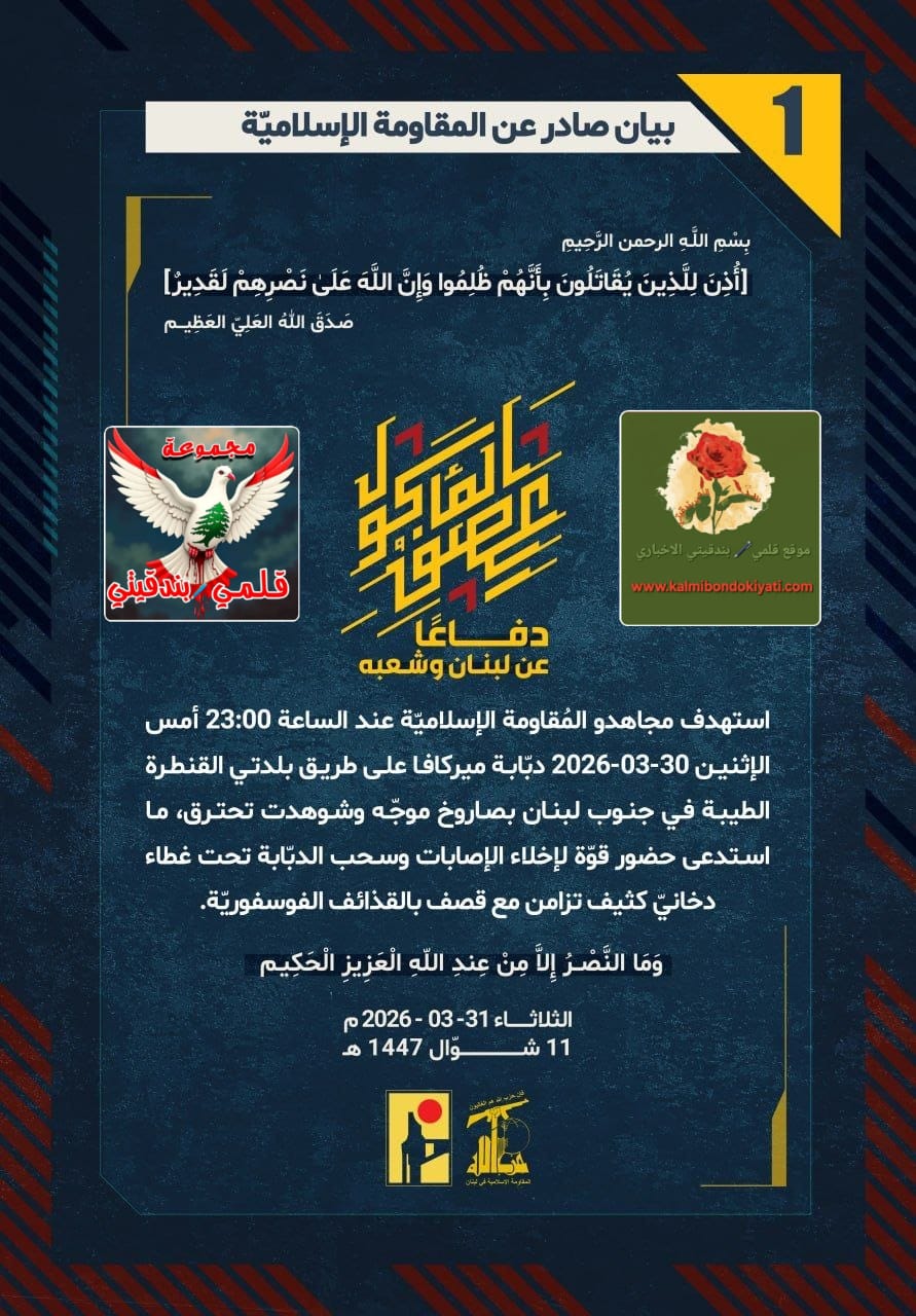 صدر بيان رقم “1” للمقاومة الاسلامية الآتي نصه:”دفاعًا عن لبنان وشعبه، استهدف مجاهدو المُقاومة الإسلاميّة عند الساعة 23:00 أمس الإثنين 30-03-2026 دبّابة ميركافا على طريق بلدتي القنطرة الطيبة في جنوب لبنان بصاروخ موجّه وشوهدت تحترق، ما استدعى حضور قوّة لإخلاء الإصابات وسحب الدبّابة تحت غطاء دخانيّ كثيف تزامن مع قصف بالقذائف الفوسفوريّة.