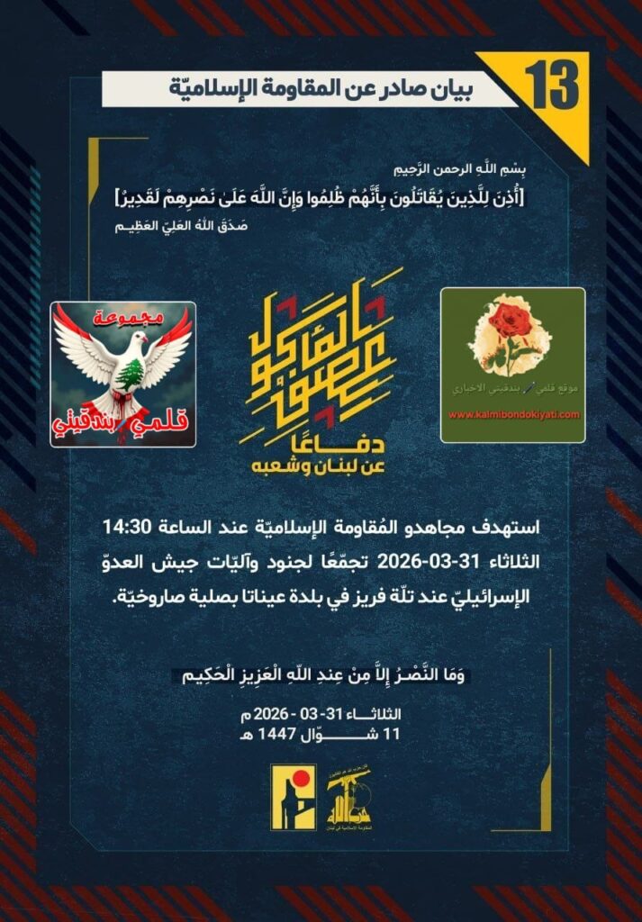 أصدرت المقاومة الاسلامية بعد البيان رقم (11 و 12) مباشرة بيان رقم “13” :”دفاعًا عن لبنان وشعبه، استهدف مجاهدو المُقاومة الإسلاميّة عند الساعة 14:30 الثلاثاء 31-03-2026 تجمّعًا لجنود وآليّات جيش العدوّ الإسرائيليّ عند تلّة فريز في بلدة عيناتا بصلية صاروخيّة.