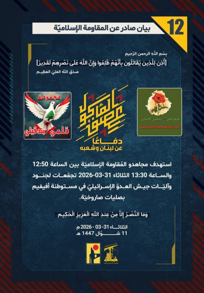 أصدرت المقاومة الاسلامية بعد البيان رقم “11” مباشرة بيان رقم 12″ :”دفاعًا عن لبنان وشعبه، استهدف مجاهدو المُقاومة الإسلاميّة بين الساعة 12:50 والساعة 13:30 الثلاثاء 31-03-2026 تجمّعات لجنود وآليّات جيش العدوّ الإسرائيليّ في مستوطنة أفيفيم بصلياتٍ صاروخيّة.