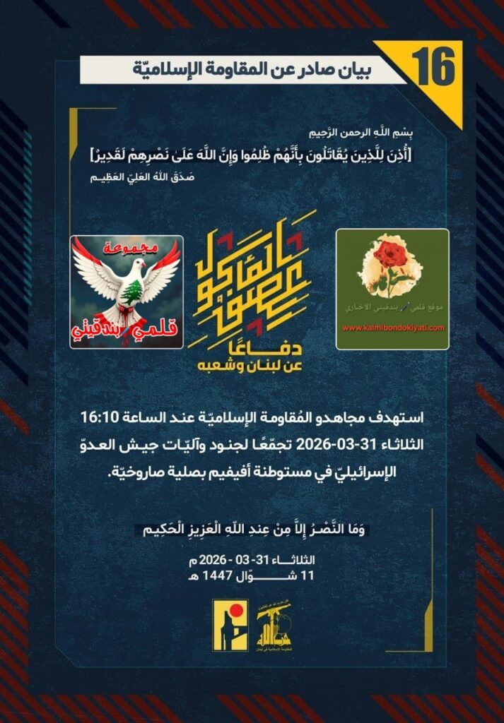 ุฃุตุฏุฑุช ุงูู ูุงูู ุฉ ุงูุงุณูุงู ูุฉ ุจุนุฏ ุงูุจูุงู ุฑูู (14 ู 15) ุจุงุดุฑุฉ ุจูุงู ุฑูู “16” :โุฏูุงุนูุง ุนู ูุจูุงู ูุดุนุจูุ ุงุณุชูุฏู ู ุฌุงูุฏู ุงูู ููุงูู ุฉ ุงูุฅุณูุงู ููุฉ ุนูุฏ ุงูุณุงุนุฉ 16:10 ุงูุซูุงุซุงุก 31-03-2026 ุชุฌู ูุนูุง ูุฌููุฏ ูุขูููุงุช ุฌูุด ุงูุนุฏูู ุงูุฅุณุฑุงุฆูููู ูู ู ุณุชูุทูุฉ ุฃููููู ุจุตููุฉ ุตุงุฑูุฎููุฉ.