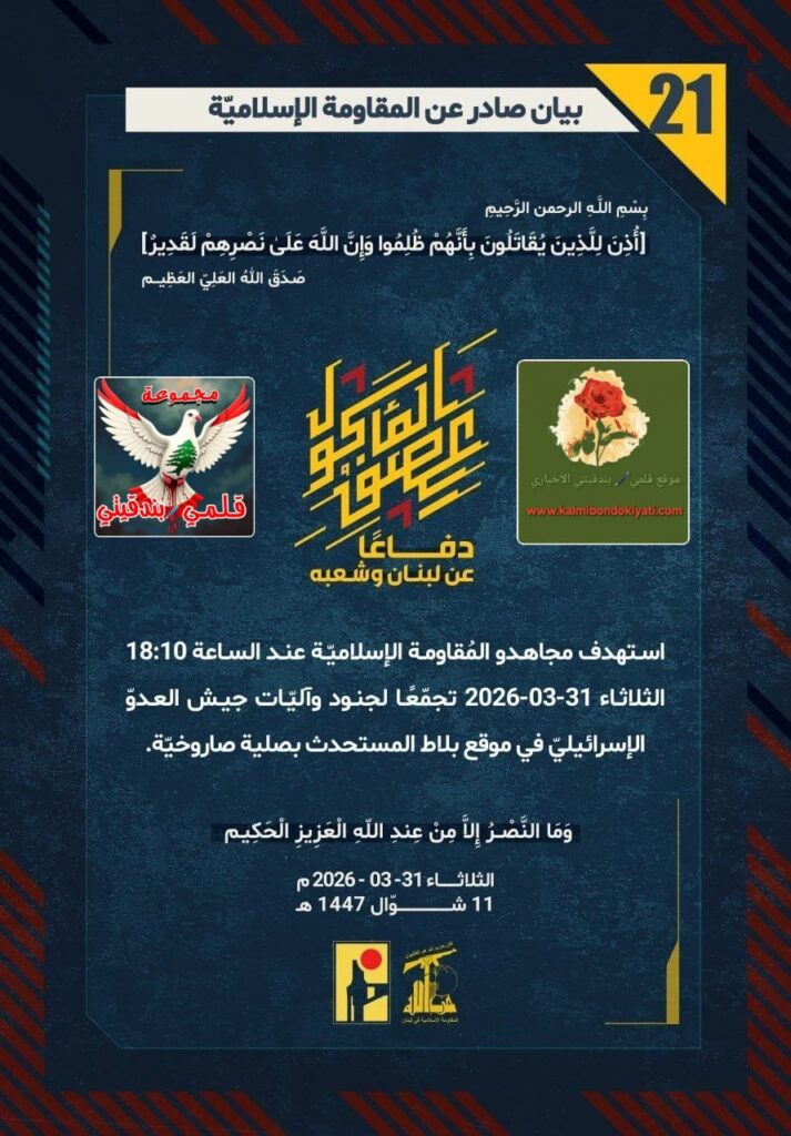 ุฃุตุฏุฑุช ุงู„ู…ู‚ุงูˆู…ุฉ ุงู„ุงุณู„ุงู…ูŠุฉ ุจุนุฏ ุงู„ุจูŠุงู† ุฑู‚ู… (19 ูˆ 20) ู…ุจุงุดุฑุฉ ุจูŠุงู† ุฑู‚ู… “21” :โ€ุฏูุงุนู‹ุง ุนู† ู„ุจู†ุงู† ูˆุดุนุจู‡ุŒ ุงุณุชู‡ุฏู ู…ุฌุงู‡ุฏูˆ ุงู„ู…ูู‚ุงูˆู…ุฉ ุงู„ุฅุณู„ุงู…ูŠู‘ุฉ ุนู†ุฏ ุงู„ุณุงุนุฉ 18:10 ุงู„ุซู„ุงุซุงุก 31-03-2026 ุชุฌู…ู‘ุนู‹ุง ู„ุฌู†ูˆุฏ ูˆุขู„ูŠู‘ุงุช ุฌูŠุด ุงู„ุนุฏูˆู‘ ุงู„ุฅุณุฑุงุฆูŠู„ูŠู‘ ููŠ ุจู„ุฏุฉ ูŠุงุฑูˆู† ุจุตู„ูŠุฉ ุตุงุฑูˆุฎูŠู‘ุฉ.