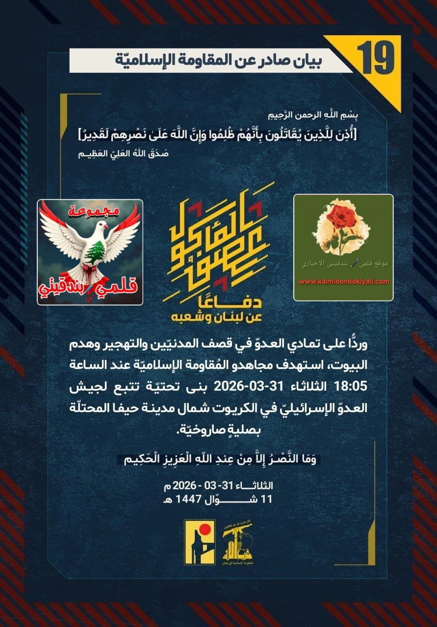 ุตุฏุฑ ุจูŠุงู† ุฑู‚ู…’19’ ู„ู„ู…ู‚ุงูˆู…ุฉ ุงู„ุงุณู„ุงู…ูŠุฉ ุงู„ุขุชูŠ ู†ุตู‡:”ุฏูุงุนู‹ุง ุนู† ู„ุจู†ุงู† ูˆุดุนุจู‡ุŒ ูˆุฑุฏู‘ู‹ุง ุนู„ู‰ ุชู…ุงุฏูŠ ุงู„ุนุฏูˆู‘ ููŠ ู‚ุตู ุงู„ู…ุฏู†ูŠู‘ูŠู† ูˆุงู„ุชู‡ุฌูŠุฑ ูˆู‡ุฏู… ุงู„ุจูŠูˆุชุŒ ุงุณุชู‡ุฏู ู…ุฌุงู‡ุฏูˆ ุงู„ู…ูู‚ุงูˆู…ุฉ ุงู„ุฅุณู„ุงู…ูŠู‘ุฉ ุนู†ุฏ ุงู„ุณุงุนุฉ 18:05 ุงู„ุซู„ุงุซุงุก 31-03-2026 ุจู†ู‰ ุชุญุชูŠู‘ุฉ ุชุชุจุน ู„ุฌูŠุด ุงู„ุนุฏูˆู‘ ุงู„ุฅุณุฑุงุฆูŠู„ูŠู‘ ููŠ ุงู„ูƒุฑูŠูˆุช ุดู…ุงู„ ู…ุฏูŠู†ุฉ ุญูŠูุง ุงู„ู…ุญุชู„ู‘ุฉ ุจุตู„ูŠุฉู ุตุงุฑูˆุฎูŠู‘ุฉ.