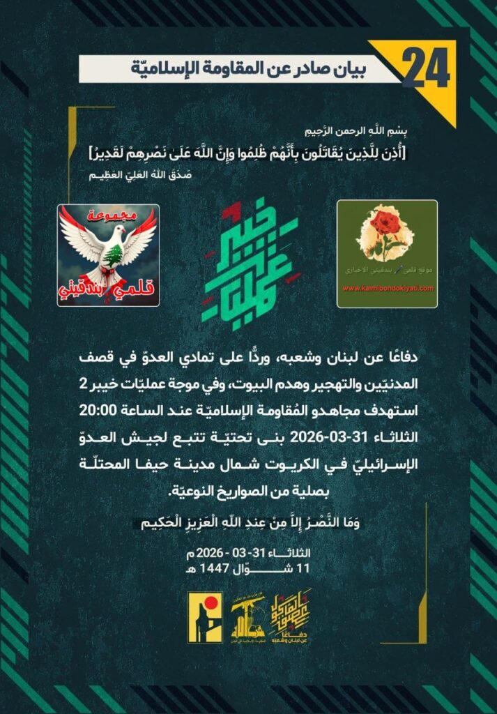 ุฃุตุฏุฑุช ุงูู ูุงูู ุฉ ุงูุงุณูุงู ูุฉ ุจุนุฏ ุงูุจูุงู ุฑูู (22 ู 23) ู ุจุงุดุฑุฉ ุจูุงู ุฑูู ” 24″ :โุฏูุงุนูุง ุนู ูุจูุงู ูุดุนุจูุ ูุฑุฏููุง ุนูู ุชู ุงุฏู ุงูุนุฏูู ูู ูุตู ุงูู ุฏููููู ูุงูุชูุฌูุฑ ููุฏู ุงูุจููุชุ ููู ู ูุฌุฉ ุนู ูููุงุช ุฎูุจุฑ 2 ุงุณุชูุฏู ู ุฌุงูุฏู ุงูู ููุงูู ุฉ ุงูุฅุณูุงู ููุฉ ุนูุฏ ุงูุณุงุนุฉ 20:00 ุงูุซูุงุซุงุก 31-03-2026 ุจูู ุชุญุชููุฉ ุชุชุจุน ูุฌูุด ุงูุนุฏูู ุงูุฅุณุฑุงุฆูููู ูู ุงููุฑููุช ุดู ุงู ู ุฏููุฉ ุญููุง ุงูู ุญุชููุฉ ุจุตููุฉ ู ู ุงูุตูุงุฑูุฎ ุงูููุนููุฉ.