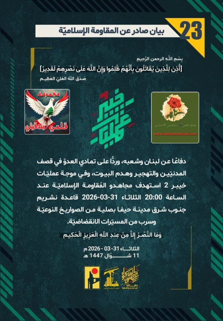 ุฃุตุฏุฑุช ุงูู ูุงูู ุฉ ุงูุงุณูุงู ูุฉ ุจุนุฏ ุงูุจูุงู ุฑูู “22” ู ุจุงุดุฑุฉ ุจูุงู ุฑูู “23”:โุฏูุงุนูุง ุนู ูุจูุงู ูุดุนุจูุ ูุฑุฏููุง ุนูู ุชู ุงุฏู ุงูุนุฏูู ูู ูุตู ุงูู ุฏููููู ูุงูุชูุฌูุฑ ููุฏู ุงูุจููุชุ ููู ู ูุฌุฉ ุนู ูููุงุช ุฎูุจุฑ 2ุ ุงุณุชูุฏู ู ุฌุงูุฏู ุงูู ููุงูู ุฉ ุงูุฅุณูุงู ููุฉ ุนูุฏ ุงูุณุงุนุฉ 20:00 ุงูุซูุงุซุงุก 31-03-2026 ูุงุนุฏุฉ ูุดุฑูู ุฌููุจ ุดุฑู ู ุฏููุฉ ุญููุง ุจุตููุฉ ู ู ุงูุตูุงุฑูุฎ ุงูููุนููุฉ ูุณุฑุจ ู ู ุงูู ุณููุฑุงุช ุงูุงููุถุงุถููุฉ.