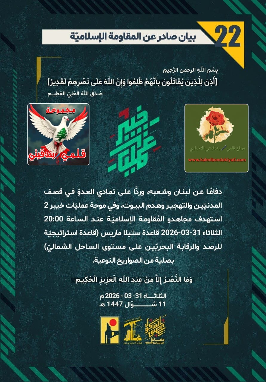 ุตุฏุฑ ุจูุงู ุฑูู “22” ููู ูุงูู ุฉ ุงูุงุณูุงู ูุฉ ุงูุขุชู ูุตู:”ุฏูุงุนูุง ุนู ูุจูุงู ูุดุนุจูุ ูุฑุฏููุง ุนูู ุชู ุงุฏู ุงูุนุฏูู ูู ูุตู ุงูู ุฏููููู ูุงูุชูุฌูุฑ ููุฏู ุงูุจููุชุ ููู ู ูุฌุฉ ุนู ูููุงุช ุฎูุจุฑ 2 ุงุณุชูุฏู ู ุฌุงูุฏู ุงูู ููุงูู ุฉ ุงูุฅุณูุงู ููุฉ ุนูุฏ ุงูุณุงุนุฉ 20:00 ุงูุซูุงุซุงุก 31-03-2026 ูุงุนุฏุฉ ุณุชููุง ู ุงุฑูุณ (ูุงุนุฏุฉ ุงุณุชุฑุงุชูุฌููุฉ ููุฑุตุฏ ูุงูุฑูุงุจุฉ ุงูุจุญุฑูููู ุนูู ู ุณุชูู ุงูุณุงุญู ุงูุดู ุงููู) ุจุตููุฉ ู ู ุงูุตูุงุฑูุฎ ุงูููุนูุฉ.