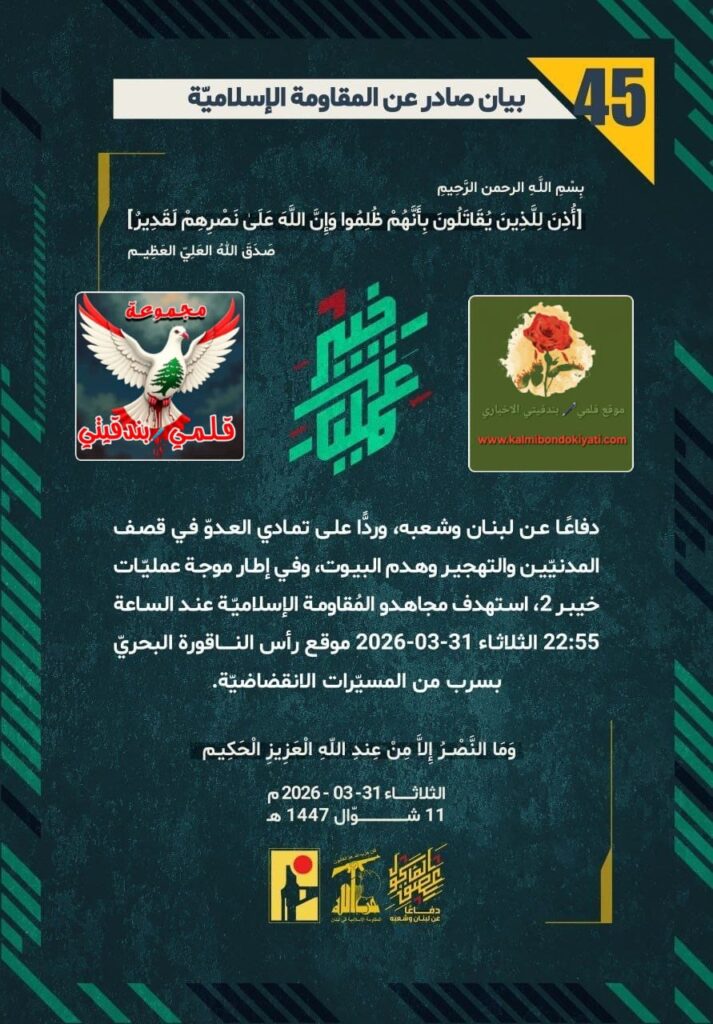 ุตุฏุฑ ุจูุงู ุฑูู “44” ููู ูุงูู ุฉ ุงูุงุณูุงู ูุฉ ุงูุขุชู ูุตู:”ุฏูุงุนูุง ุนู ูุจูุงู ูุดุนุจูุ ูุฑุฏููุง ุนูู ุชู ุงุฏู ุงูุนุฏูู ูู ูุตู ุงูู ุฏููููู ูุงูุชูุฌูุฑ ููุฏู ุงูุจููุชุ ููู ุฅุทุงุฑ ู ูุฌุฉ ุนู ูููุงุช ุฎูุจุฑ 2ุ ุงุณุชูุฏู ู ุฌุงูุฏู ุงูู ููุงูู ุฉ ุงูุฅุณูุงู ููุฉ ุนูุฏ ุงูุณุงุนุฉ 22:15 ุงูุซูุงุซุงุก 31-03-2026 ุซููุฉ ุฒุฑุนูุช ุจุณุฑุจ ู ู ุงูู ุณููุฑุงุช ุงูุงููุถุงุถููุฉ.