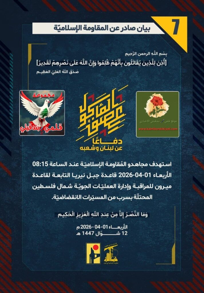 أصدرت المقاومة الاسلامية بعد البيان رقم (5 و 6)مباشرة بيان رقم “7” :”دفاعًا عن لبنان وشعبه، استهدف مجاهدو المُقاومة الإسلاميّة عند الساعة 08:15 الأربعاء 01-04-2026 قاعدة جبل نيريا التابعة لقاعدة ميرون للمراقبة وإدارة العمليّات الجويّة شمال فلسطين المحتلّة بسرب من المسيّرات الانقضاضيّة.