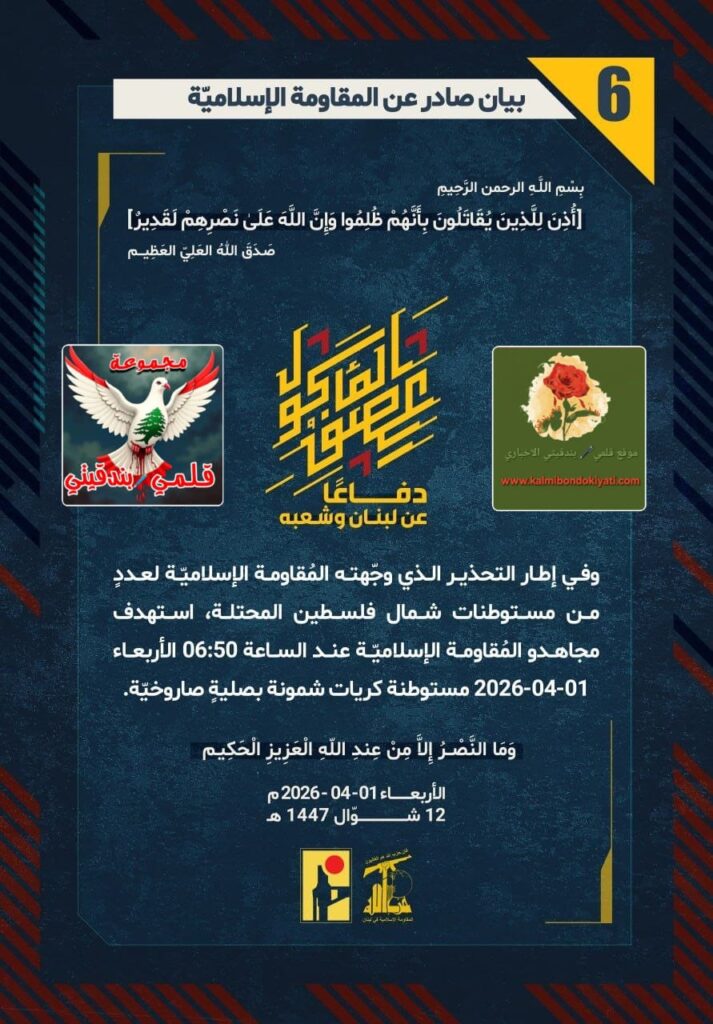 أصدرت المقاومة الاسلامية بعد البيان رقم مباشرة”5″ بيان رقم “6” :”دفاعًا عن لبنان وشعبه، وفي إطار التحذير الذي وجّهته المُقاومة الإسلاميّة لعددٍ من مستوطنات شمال فلسطين المحتلة، استهدف مجاهدو المُقاومة الإسلاميّة عند الساعة 06:50 الأربعاء 01-04-2026 مستوطنة كريات شمونة بصليةٍ صاروخيّة.
