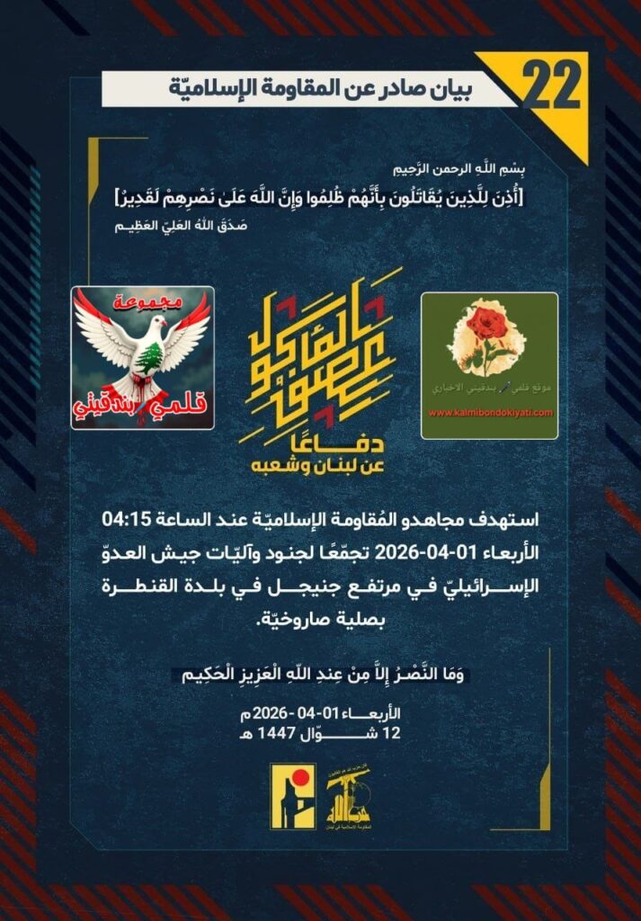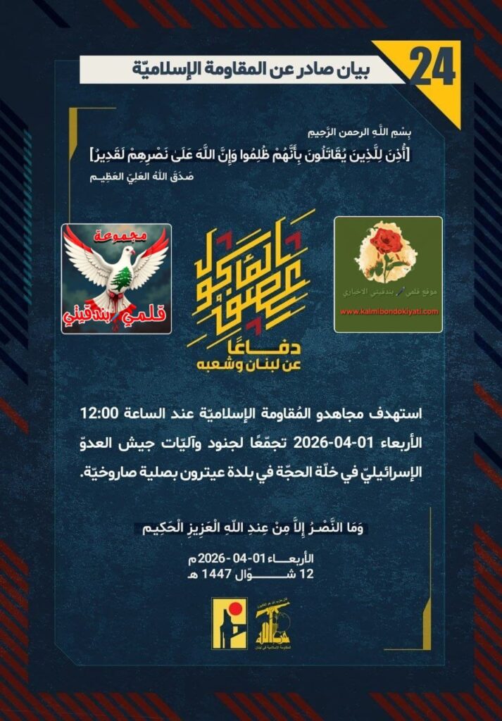 ๐ ุตุฏุฑ ุจูุงู ุฑูู (24) ููู ูุงูู ุฉ ุงูุฅุณูุงู ูุฉ ุงูุขุชู ูุตู: “ุนูุฏ ุงูุณุงุนุฉ 12:00 ุงูุฃุฑุจุนุงุก 01-04-2026ุ ุตุจูู ุฑุฌุงูู ุงููุทู ุฌุญูู ู ุตูุงุฑูุฎูู ููู ุชุฌู ูุนู ูุฌููุฏ ูุขูููุงุช ุงูุนุฏู ูู ุฎููุฉ ุงูุญุฌูุฉ (ุนูุชุฑูู).. ุงูู ูุชู ูุชุฑุจุตู ุจุฌูุดูู ุฎููู ููู ุชููุฉ!”