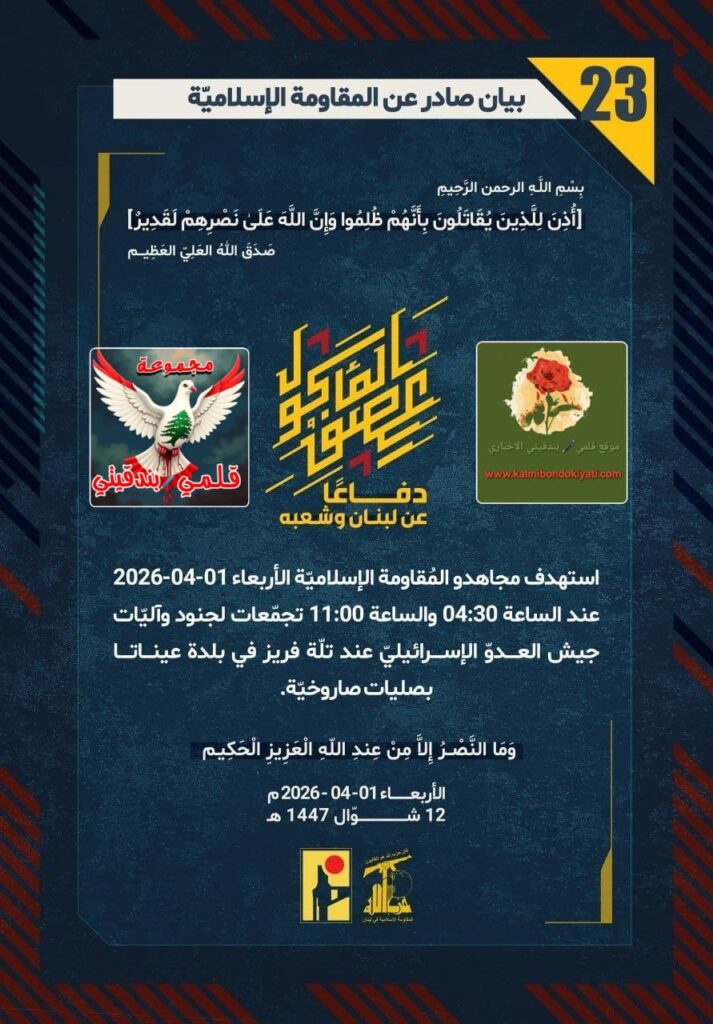 ๐ ุตุฏุฑ ุจูุงู ุฑูู (23) ููู ูุงูู ุฉ ุงูุฅุณูุงู ูุฉ ุงูุขุชู ูุตู: “ูู ู ูุงุญูุฉู ูุง ุชูุฏุฃุ ุงุณุชูุฏูู ุฑุฌุงูู ุงููุทู ููู ุงูุฃุฑุจุนุงุก 01-04-2026 (ุนูุฏ ุงูุณุงุนุชูู 04:30 ู11:00) ุชุฌู ูุนุงุชู ุฌููุฏูู ูู ุชููุฉ ูุฑูุฒ (ุนููุงุชุง) ุจุตููุงุชู ุตุงุฑูุฎููุฉู ู ุชุชุงููุฉ.. ููุฑุงูููุง ุชูุงุญูููู ูู ููู ุณุงุนุฉ!”