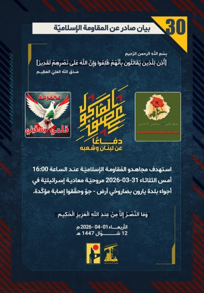 🛑 صدر بيان رقم (30) للمقاومة الإسلامية الآتي نصه: “في عمليةٍ نوعية، استهدفَ أبطالُ حزب الله عند الساعة 16:00 أمس الثلاثاء 31-03-2026 مروحيّة معادية إسرائيليّة في أجواء بلدة يارون بصاروخَي أرض – جوّ وحقّقوا إصابة مؤكّدة.. نيرانُنا تلاحقُكم في البرِّ والجوّ!”
