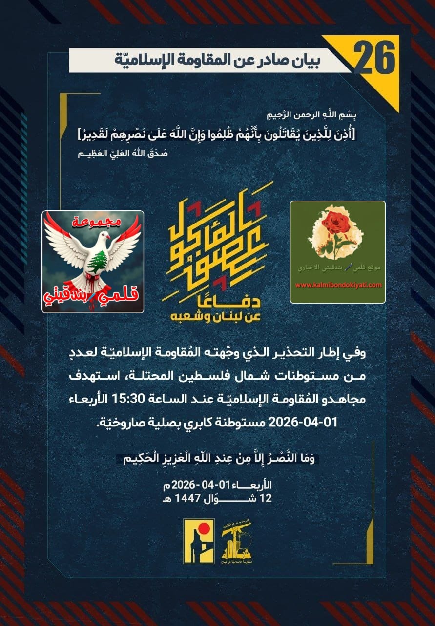 🛑 صدر بيان رقم (26) للمقاومة الإسلامية الآتي نصه: “في إطار التحذير لمستوطنات الشمال، استهدفَ أبطالُ حزب الله عند الساعة 15:30 الأربعاء 01-04-2026 مستوطنة كابري بصليةٍ صاروخيّةٍ حارقة.. تحذيراتُنا أفعالٌ تحرقُ أمنَكم الواهي!”