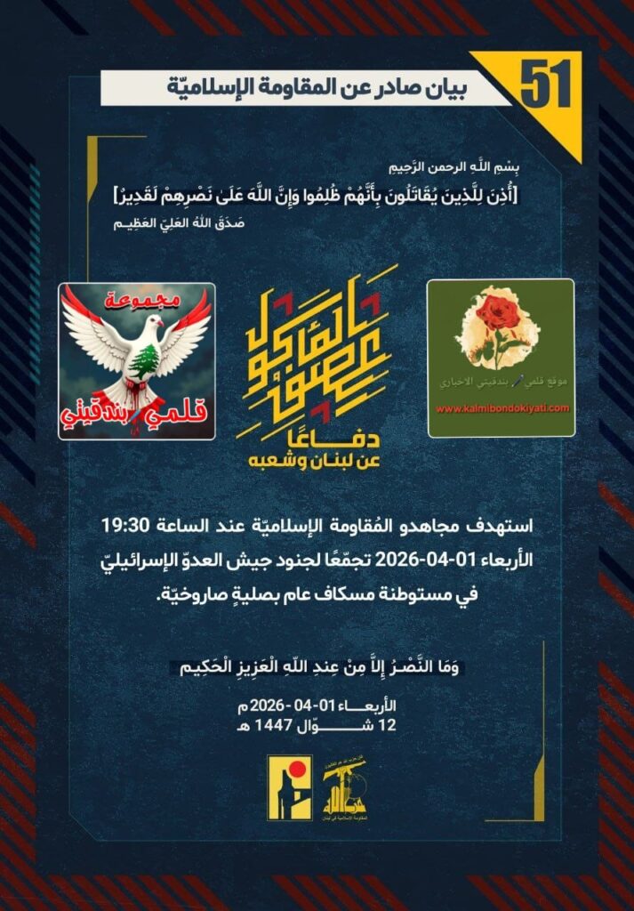 أصدرت المقاومة الاسلامية بعد البيان رقم “50” مباشرة بيان رقم “51” :”دفاعًا عن لبنان وشعبه، استهدف مجاهدو المُقاومة الإسلاميّة عند الساعة 19:30 الأربعاء 01-04-2026 تجمّعًا لجنود جيش العدوّ الإسرائيليّ في مستوطنة مسكاف عام بصليةٍ صاروخيّة.