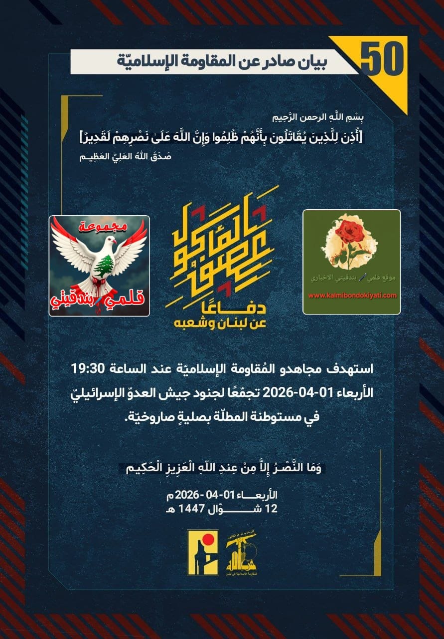 صدر بيان رقم “50” للمقاومة الاسلامية الآتي نصه:”دفاعًا عن لبنان وشعبه، استهدف مجاهدو المُقاومة الإسلاميّة عند الساعة 19:30 الأربعاء 01-04-2026 تجمّعًا لجنود جيش العدوّ الإسرائيليّ في مستوطنة المطلّة بصليةٍ صاروخيّة.