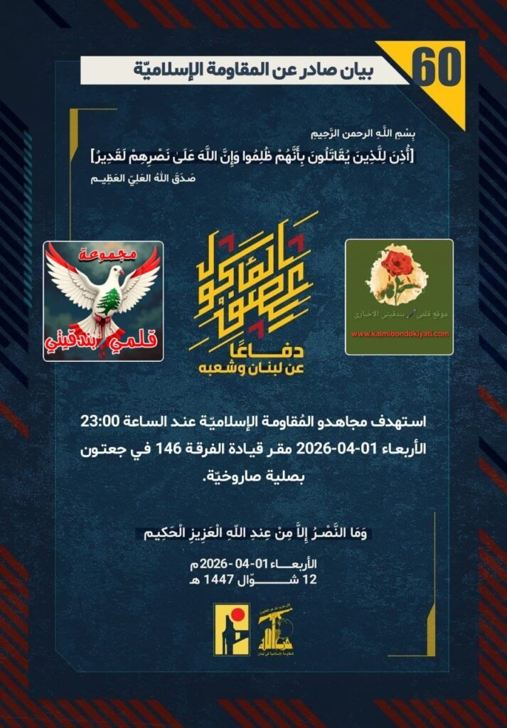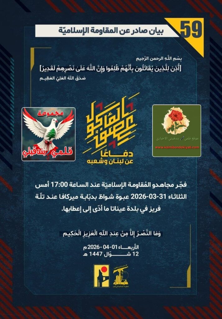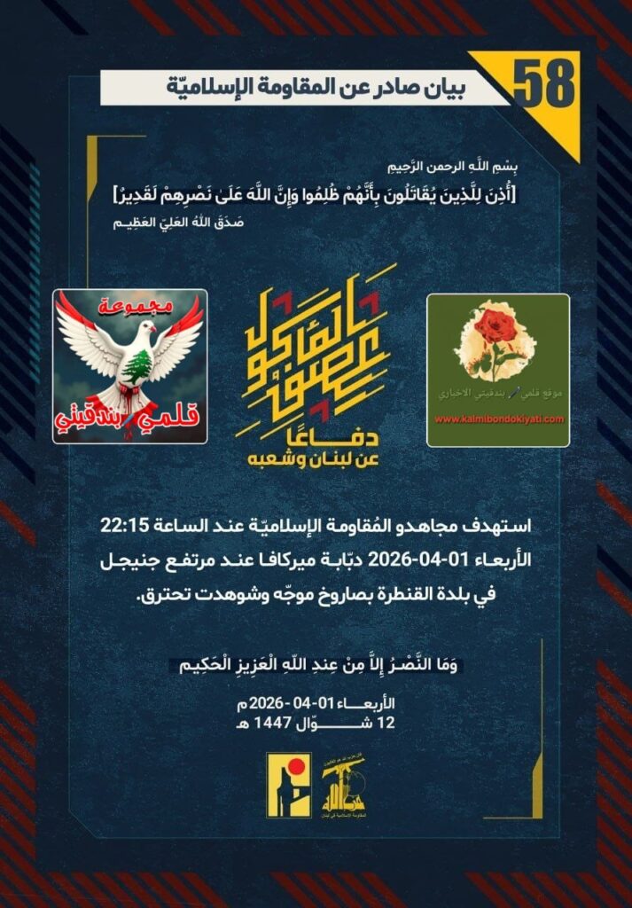 ๐ ุตุฏุฑ ุจูุงู ุฑูู (58) ููู ูุงูู ุฉ ุงูุฅุณูุงู ูุฉ ุงูุขุชู ูุตู: “ูุง ูุฑูุจู ู ู ุฌุญูู ููุง.. ุงุณุชูุฏูู ุฑุฌุงูู ุงูุญู ุจุตุงุฑูุฎู ู ูุฌูู ุนูุฏ ุงูุณุงุนุฉ 22:15 ุงูุฃุฑุจุนุงุก 01-04-2026 ุฏุจูุงุจุฉ ู ูุฑูุงูุง ุฃุฎุฑู ุนูุฏ ู ุฑุชูุน ุฌููุฌู (ุงูููุทุฑุฉ) ูุฃูุญููุช ุฅูู ูุชูุฉู ููุจ!”