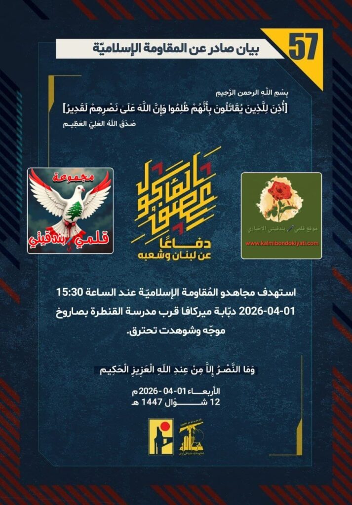 ุจูุงู ุฑูู (57) ููู ูุงูู ุฉ ุงูุฅุณูุงู ูุฉ ุงูุขุชู ูุตู: “ุจุตุงุฑูุฎู ู ูุฌููู ุญูููู ุงููููุงุฐู ุฅูู ุฑู ุงุฏุ ุฏููู ุฑุฌุงูู ุงูุญู ุนูุฏ ุงูุณุงุนุฉ 15:30 ุงูุฃุฑุจุนุงุก 01-04-2026 ุฏุจูุงุจุฉ ู ูุฑูุงูุง ูุฑุจ ู ุฏุฑุณุฉ ุงูููุทุฑุฉ ูุดููุฏุช ุชุญุชุฑู.. ูุฎุฑู ุตูุงุนุชูู ุชุญุชู ุฃูุฏุงู ููุง!”