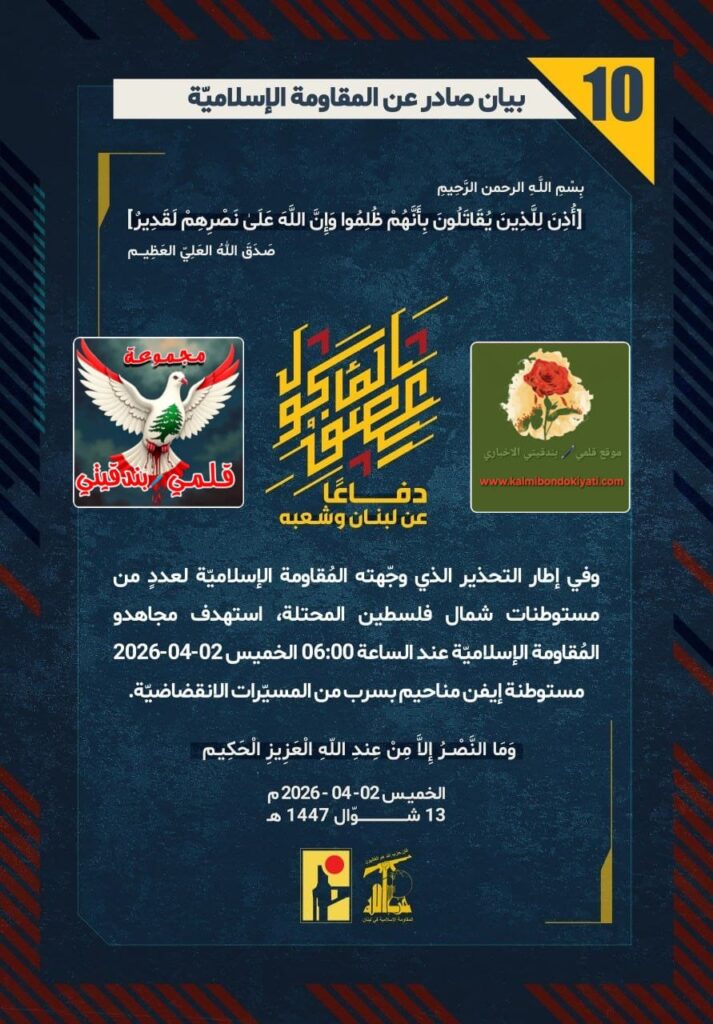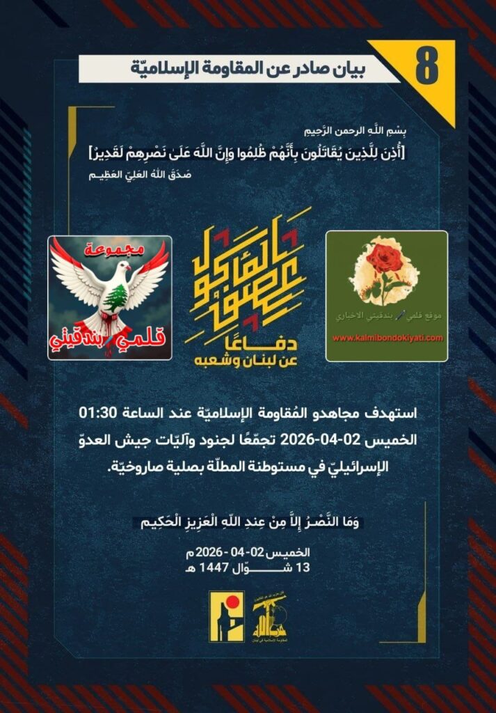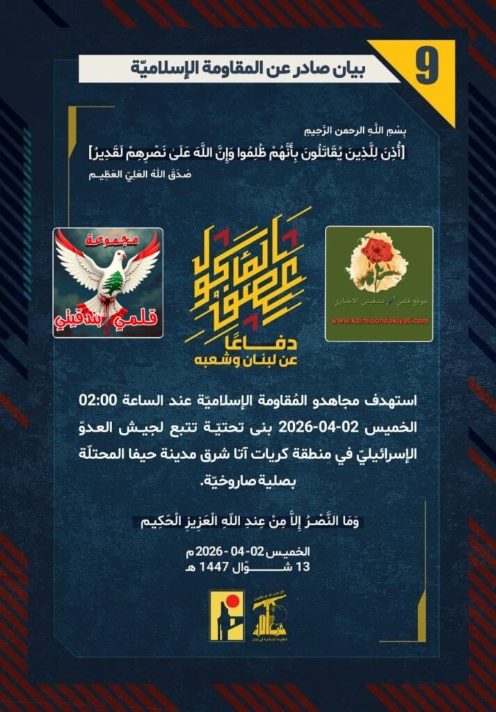 ๐Ÿ›‘ ุจูŠุงู† ุฑู‚ู… (9) ู„ู„ู…ู‚ุงูˆู…ุฉ ุงู„ุฅุณู„ุงู…ูŠุฉ ุงู„ุขุชูŠ ู†ุตู‡: “ุจุถุฑุจุงุชู ู‚ุงุตู…ุฉ ุทุงู„ุช ุฃู‡ุฏุงููŽูƒู… ุงู„ุงุณุชุฑุงุชูŠุฌูŠุฉุŒ ุงุณุชู‡ุฏููŽ ุฃุจู†ุงุกู ู†ุตุฑ ุงู„ู„ู‡ ุนู†ุฏ ุงู„ุณุงุนุฉ 02:00 ุงู„ุฎู…ูŠุณ ุจู†ู‰ ุชุญุชูŠู‘ุฉ ู„ุฌูŠุด ุงู„ุนุฏูˆ ููŠ ูƒุฑูŠุงุช ุขุชุง (ุดุฑู‚ ุญูŠูุง ุงู„ู…ุญุชู„ู‘ุฉ) ุจุตู„ูŠุฉู ุตุงุฑูˆุฎูŠู‘ุฉ.. ุนุฑูˆุดููƒู… ุชุชู‡ุงูˆู‰!”