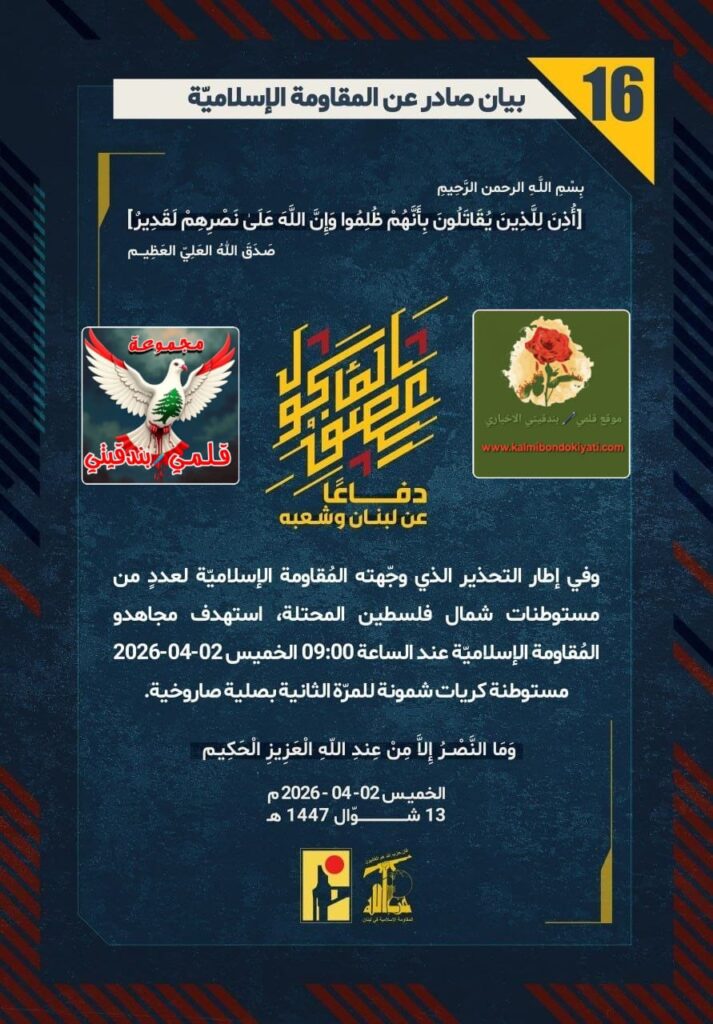 ๐ ุจูุงู ุฑูู (16) ููู ูุงูู ุฉ ุงูุฅุณูุงู ูุฉ ุงูุขุชู ูุตู: “ุจุถุฑุจุฉู ูุงุตู ุฉู ููู ุฑูุฉ ุงูุซุงููุฉุ ุงุณุชูุฏูู ุฃุจูุงุกู ูุตุฑ ุงููู ุนูุฏ ุงูุณุงุนุฉ 09:00 ุงูุฎู ูุณ ู ุณุชูุทูุฉ ูุฑูุงุช ุดู ููุฉ ุจุตููุฉู ุตุงุฑูุฎููุฉู ุญุงุฑูุฉ.. ุตูุงุฑูุฎููุง ูู ุงููุฏุฑู ุงูุฐู ูุทุงูู ุฑุคูุณูู !”