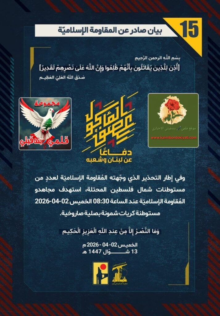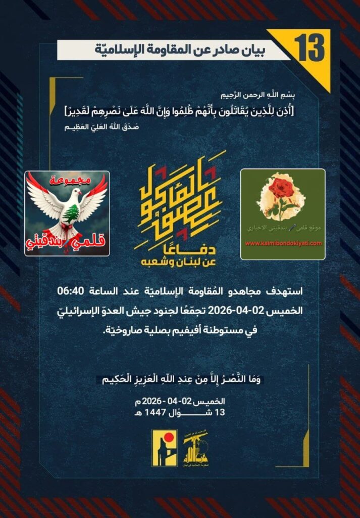 ๐ ุจูุงู ุฑูู (11) ููู ูุงูู ุฉ ุงูุฅุณูุงู ูุฉ ุงูุขุชู ูุตู: “ุจุนุฒูู ุฉู ุฃุจูุงุกู ูุตุฑ ุงูููุ ุงุณุชูุฏูู ุงูู ุฌุงูุฏูู ุนูุฏ ุงูุณุงุนุฉ 06:10 ุงูุฎู ูุณ 02-04-2026 ุชุฌู ูุนุงู ูุฌููุฏ ุงูุนุฏู ูู ู ุณุชูุทูุฉ ูุฑุคูู ุจุตููุฉู ุตุงุฑูุฎููุฉู ุญุงุฑูุฉ.. ููุฑุงูููุง ุชูุงุญูู ุฃููุงู ููู !”