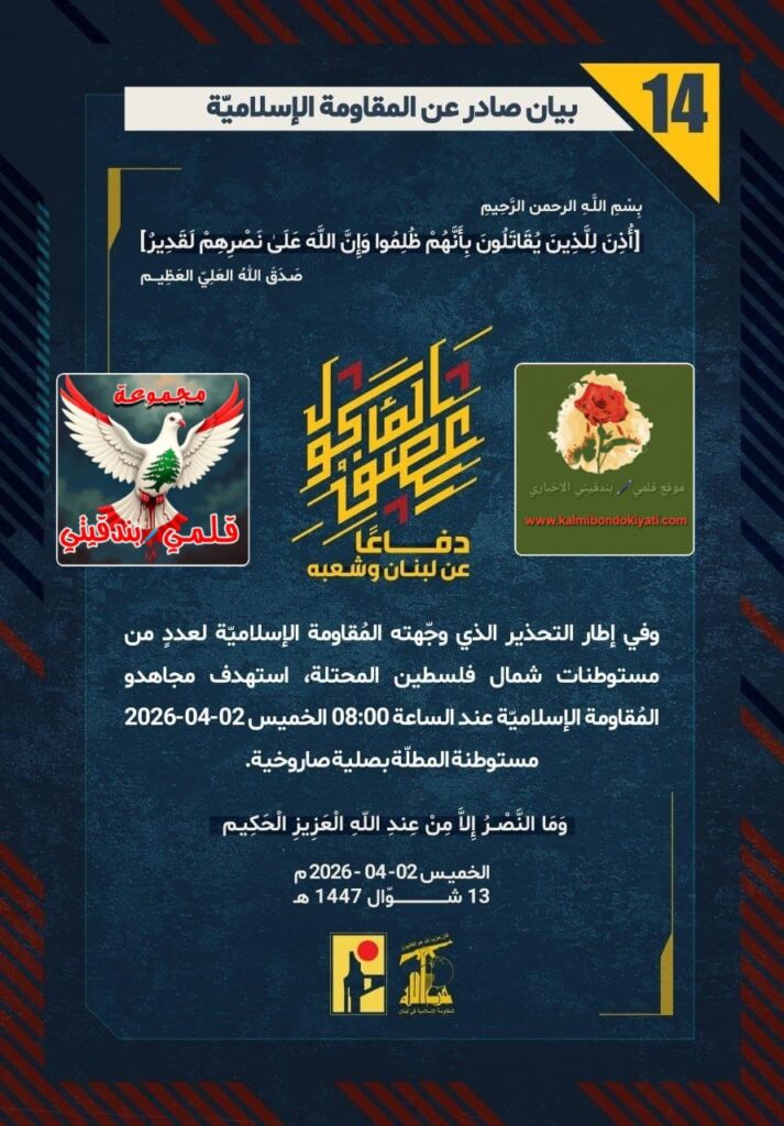 ๐ ุจูุงู ุฑูู (14) ููู ูุงูู ุฉ ุงูุฅุณูุงู ูุฉ ุงูุขุชู ูุตู: “ููุงุกู ููุชุญุฐูุฑ ุงูุตุงุฏูุ ุฏููู ุฃุจูุงุกู ูุตุฑ ุงููู ุนูุฏ ุงูุณุงุนุฉ 08:00 ุงูุฎู ูุณ ู ุณุชูุทูุฉ ุงูู ุทููุฉ ุจุตููุฉู ุตุงุฑูุฎููุฉู ู ุฑูุฒุฉ.. ุฌูุดููู ุงููุฑููู ูููุงุฑู ุฃู ุงู ู ุถุฑุจุงุชููุง!”