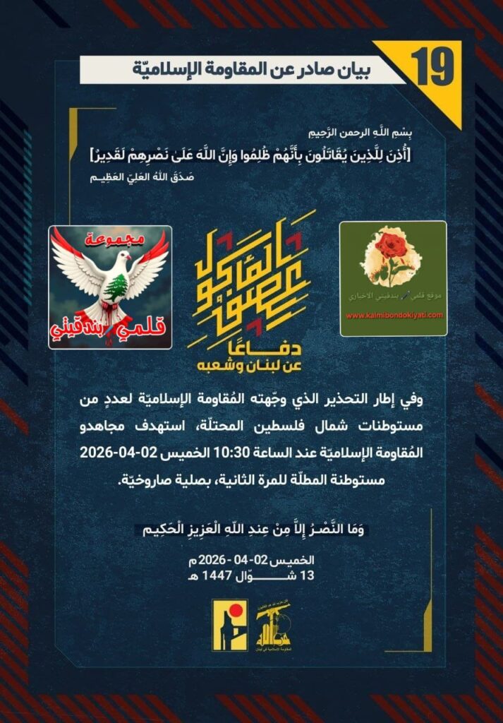 أصدرت المقاومة الاسلامية بعد البيان رقم (17 و 18) مباشرة بيان رقم “19” :”دفاعًا عن لبنان وشعبه، وفي إطار التحذير الذي وجّهته المُقاومة الإسلاميّة لعددٍ من مستوطنات شمال فلسطين المحتلّة، استهدف مجاهدو المُقاومة الإسلاميّة عند الساعة 10:30 الخميس 02-04-2026 مستوطنة المطلّة للمرة الثانية، بصلية صاروخيّة.