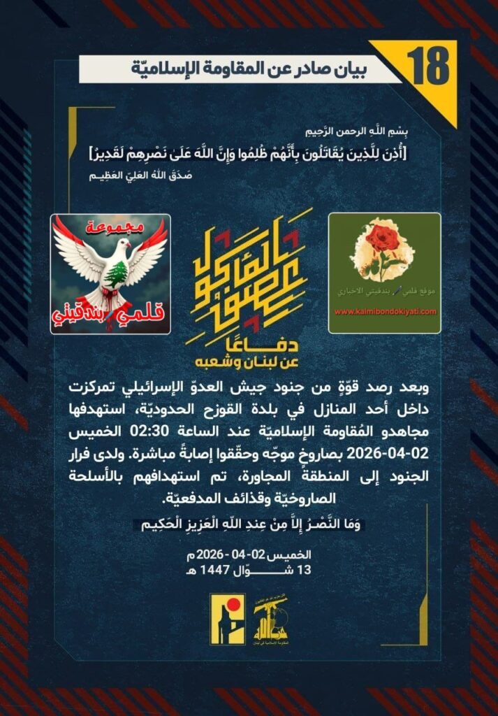 أصدرت المقاومة الاسلامية بعد البيان رقم “17” مباشرة بيان رقم “18” :”دفاعًا عن لبنان وشعبه، وبعد رصد قوّةٍ من جنود جيش العدوّ الإسرائيلي تمركزت داخل أحد المنازل في بلدة القوزح الحدوديّة، استهدفها مجاهدو المُقاومة الإسلاميّة عند الساعة 02:30 الخميس 02-04-2026 بصاروخٍ موجّه وحقّقوا إصابةً مباشرة. ولدى فرار الجنود إلى المنطقة المجاورة، تم استهدافهم بالأسلحة الصاروخيّة وقذائف المدفعيّة.